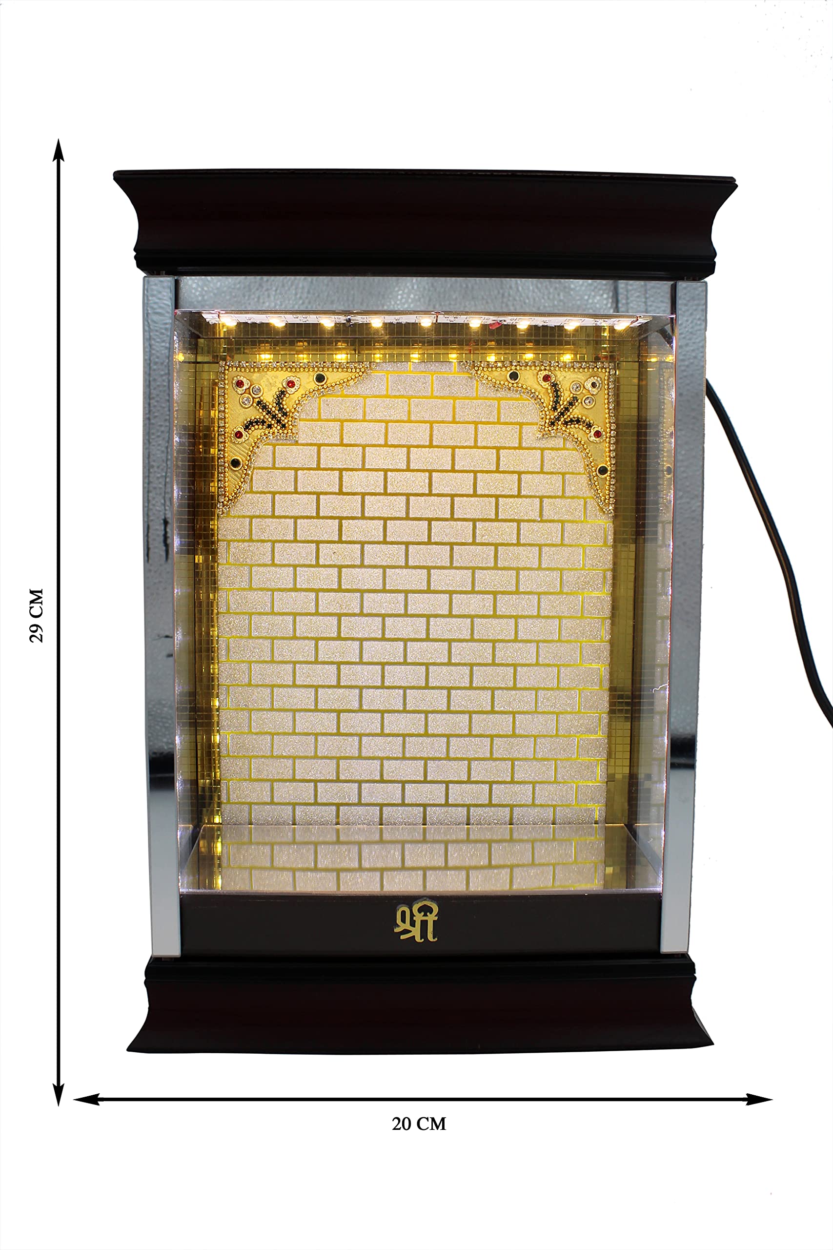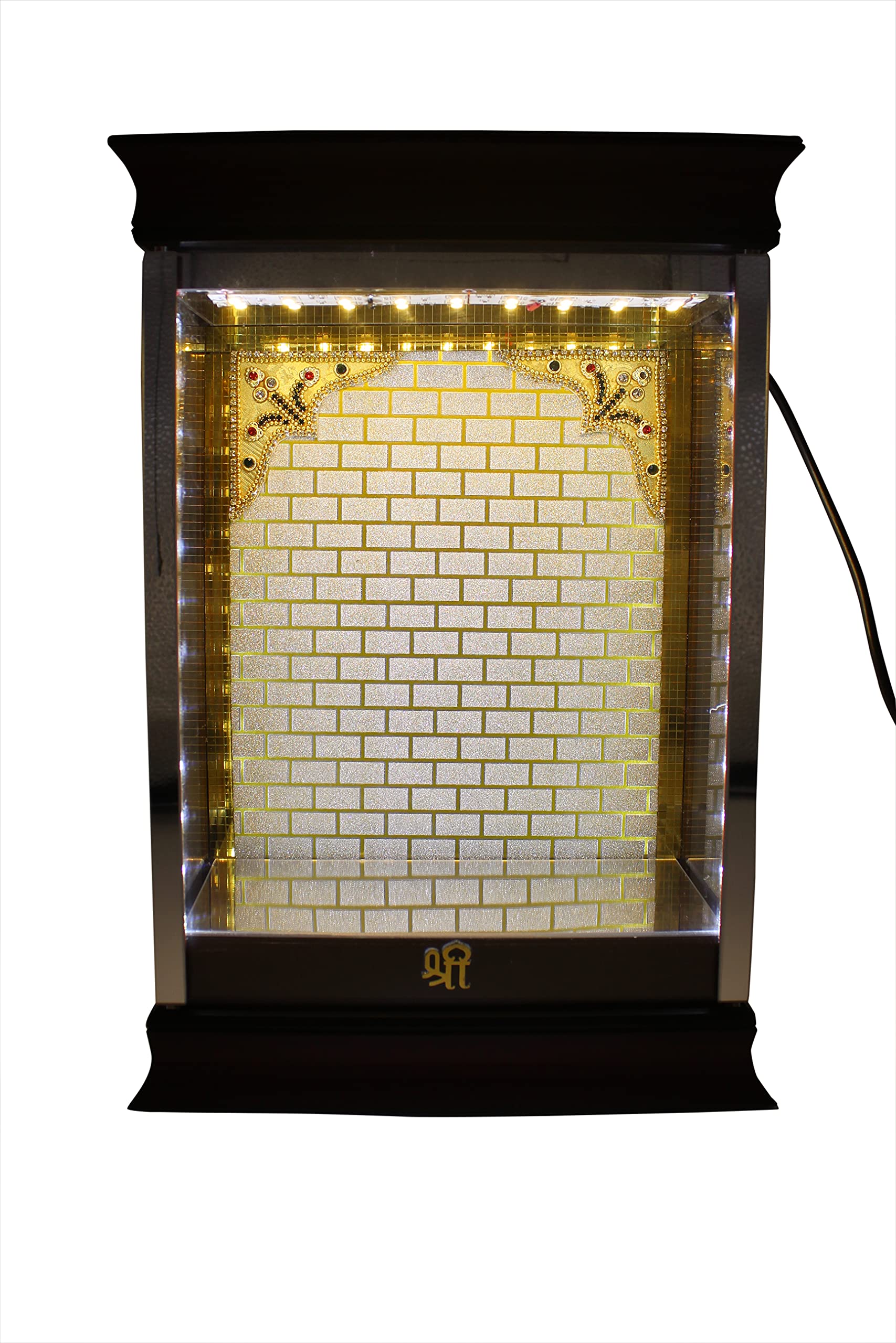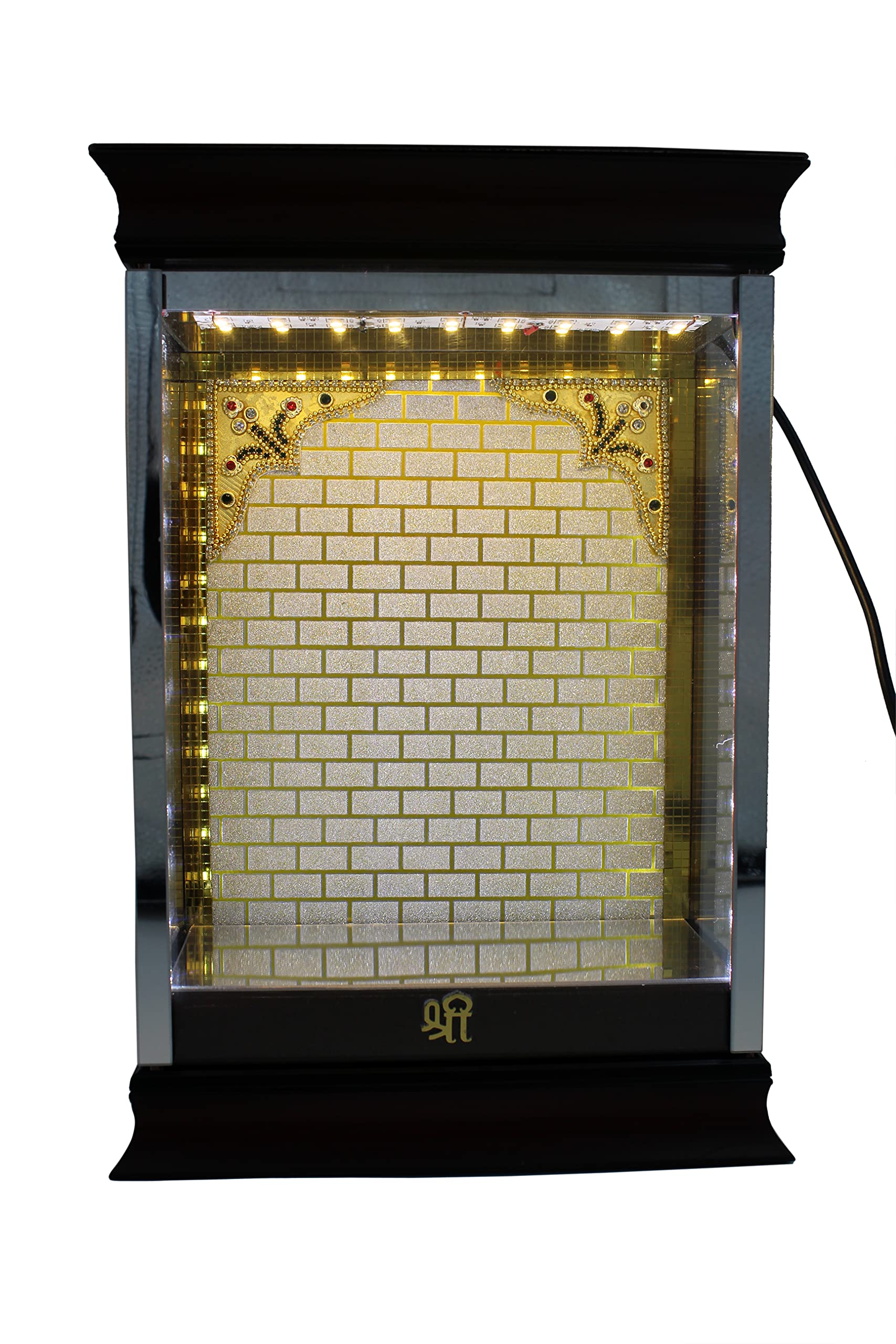 STONE WORK Presented A Desiner Acrylic Cabinet With Beautiful Background Graffic With Golden And White luminescent LED lights with external power supply for easy repair and replacement With 12V AC Dietachable Adaptor.This Cabinet Base material is high density water resistant sturdy boards and its unlike partical boards giving extra strength and durability above all longivityImported Acrylic Cabinet BoxCabinet Covered 3 Side With Magnificent Transparent Glass (visibility Is To Good).Its Best For Table Top Decoration In Puja RoomLiving Room Or Bed Room