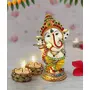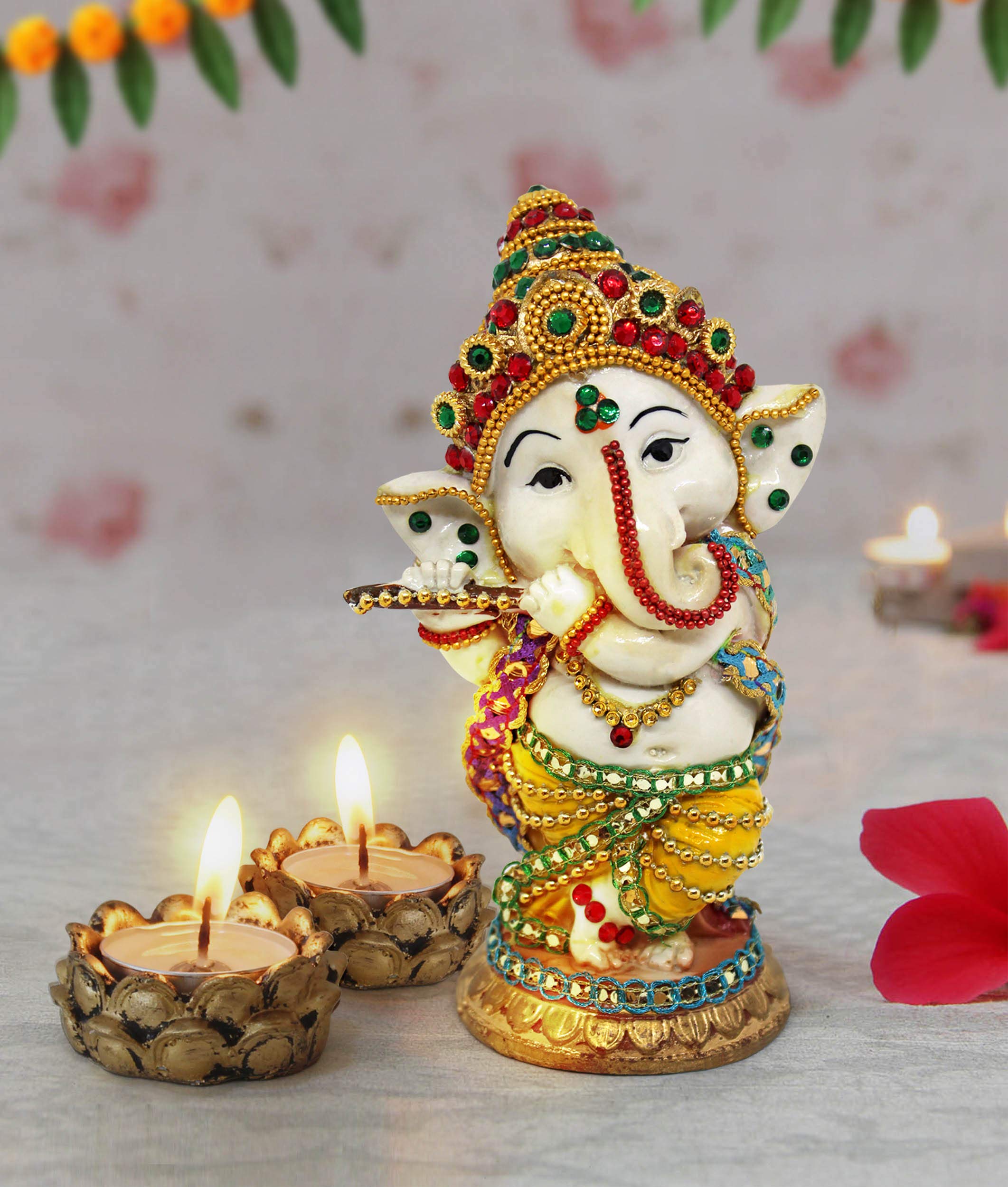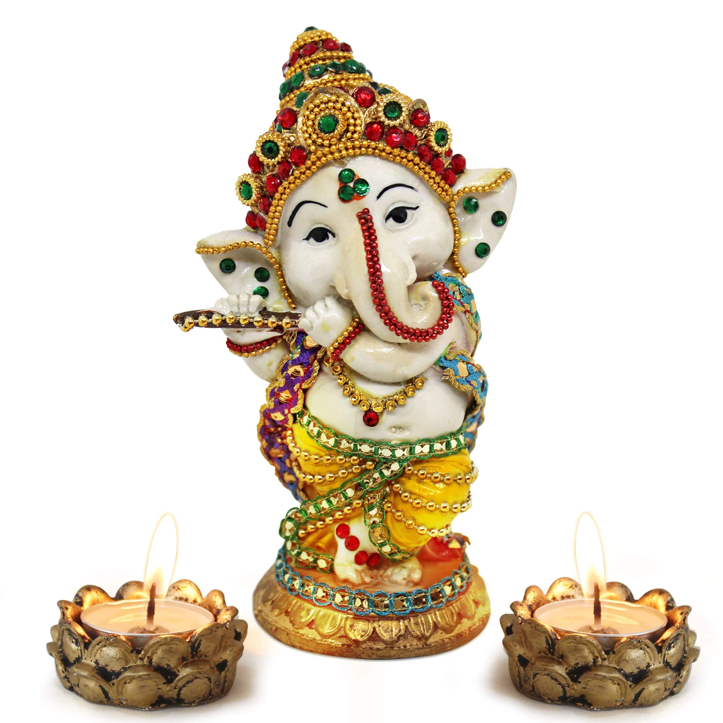 Brighten up the dull and boring ambience of your living room . This murli ganesha lotus tea light holder will not fail to leave a lasting impression on your guest. Made from metal this wonderful piece of art will surely accentuate your home decor. It serves as a great gift especially around religious celebrations and festivities. Each tea light holder is diligently handcrafted by skilled artisans from TIED RIBBONS using various traditional techniques. A handcrafted piece of art complements your home interiors be it living room dining area cafe or restuarants or Diwali Lighting Decoration.