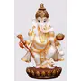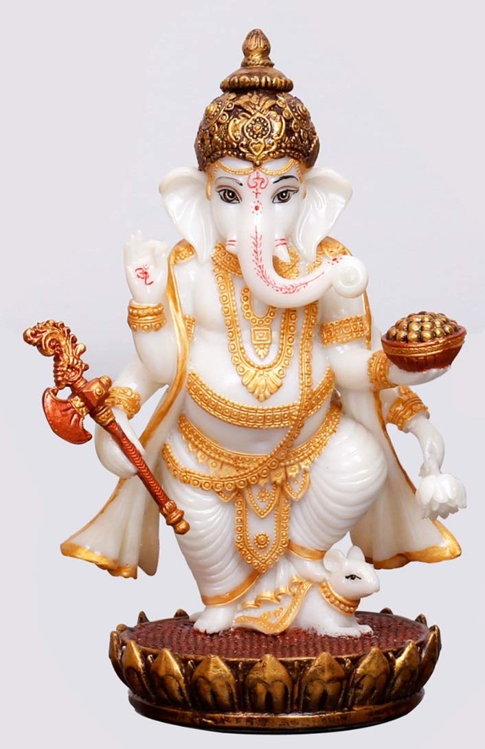 Ganesh is standing on a lotus flower in a dancing pose with his four arms. Nritya or dancing Ganapati is the fifteenth of the thirty two forms of Lord Ganapati. In his right hands he holds an axe and his upper arm is giving the mudra for blessing. His left arms hold the flower and his favorite sweet called modaka.
