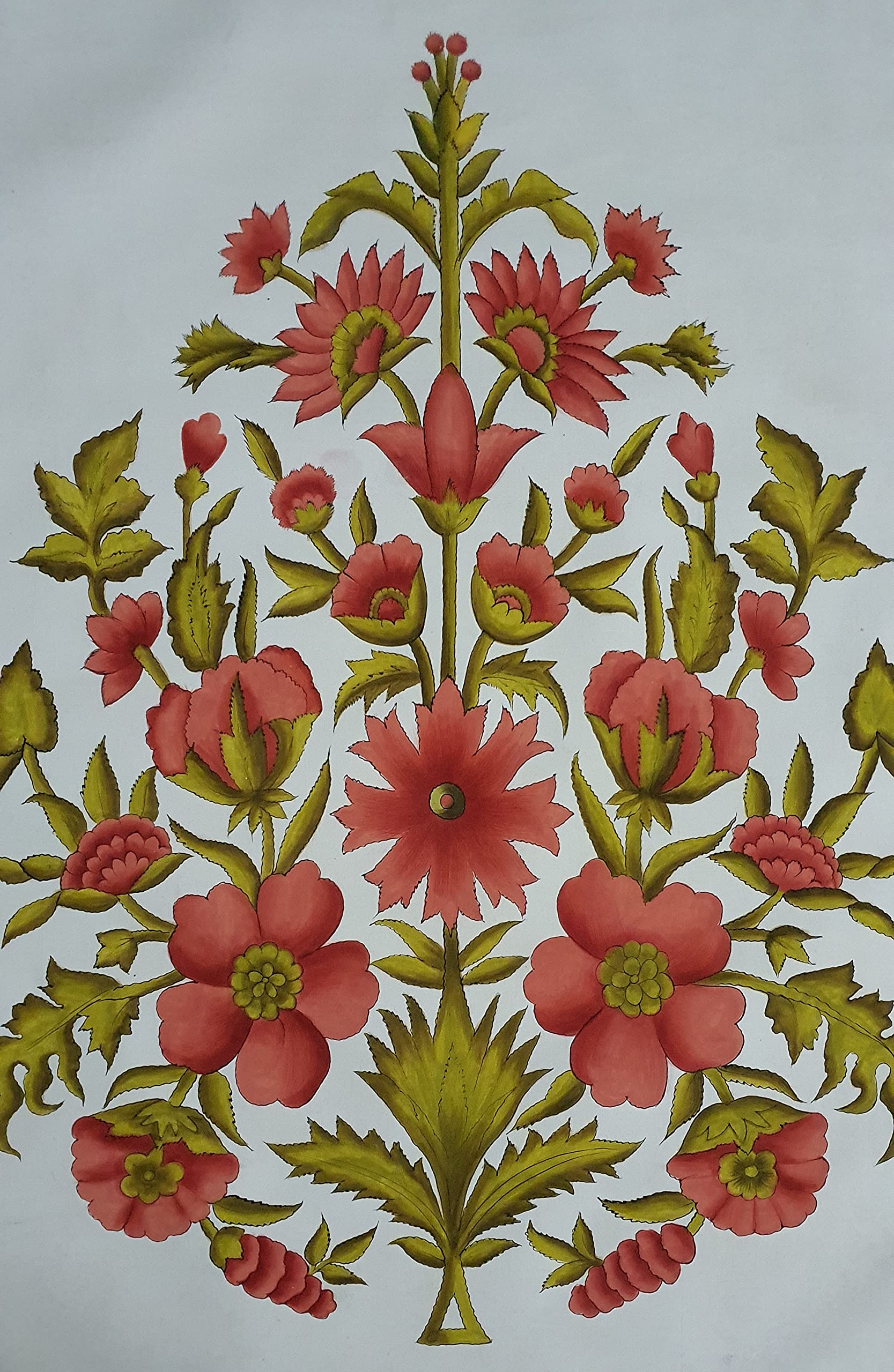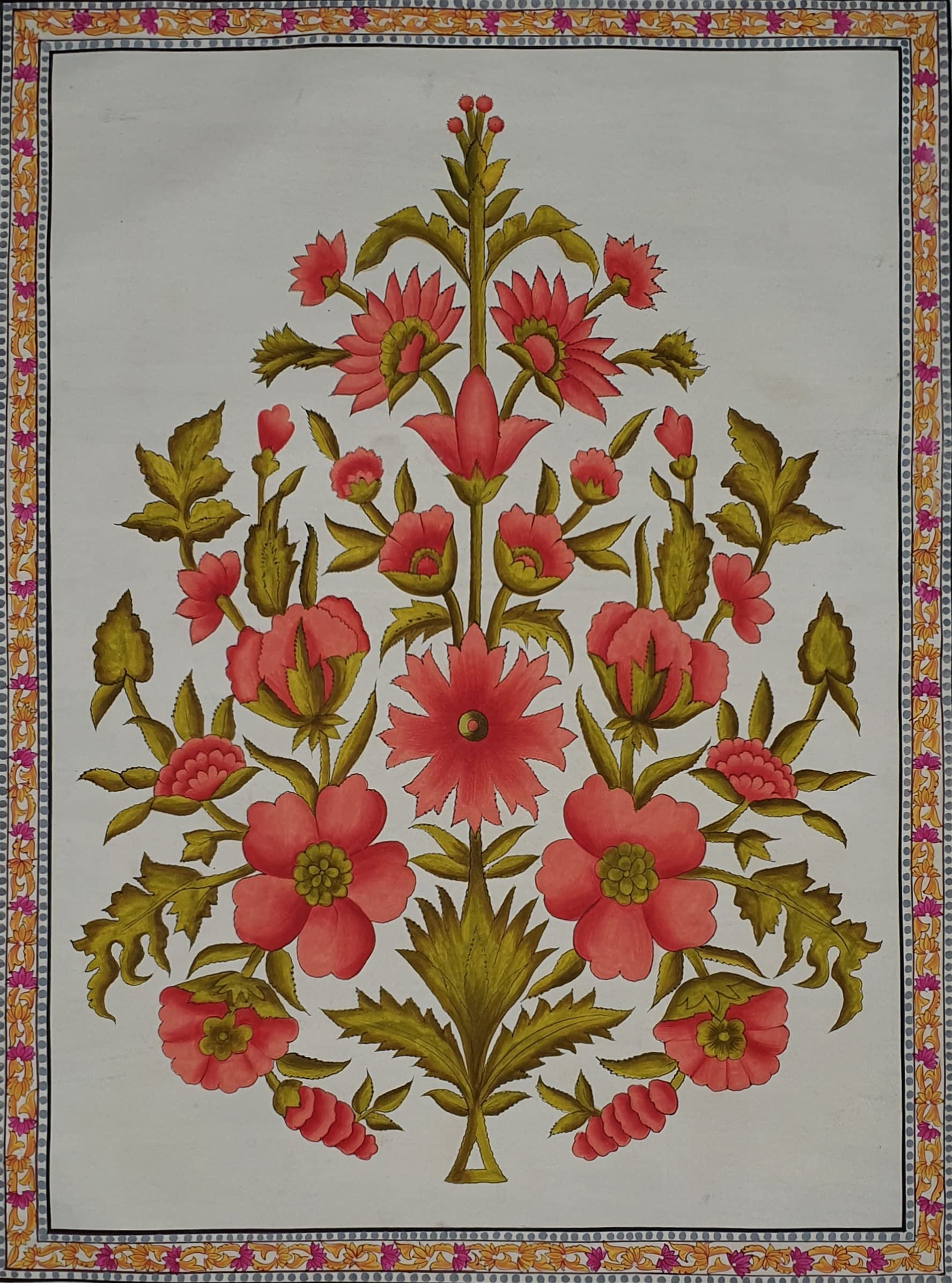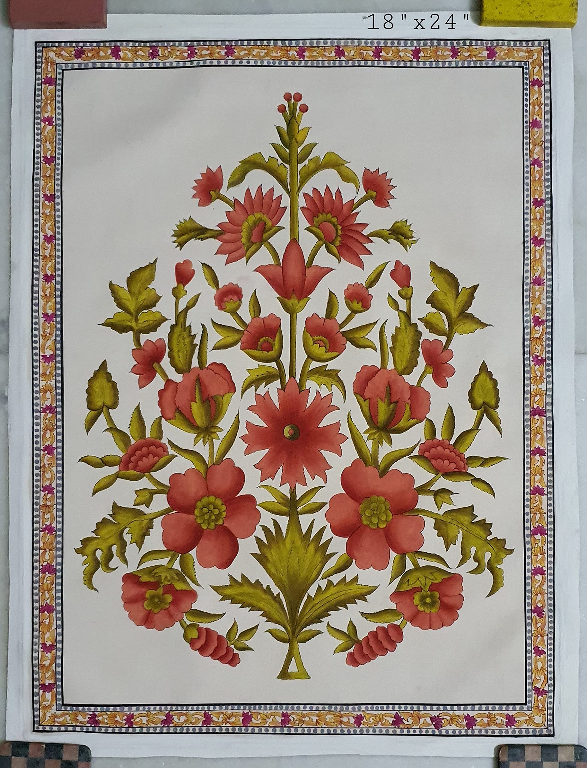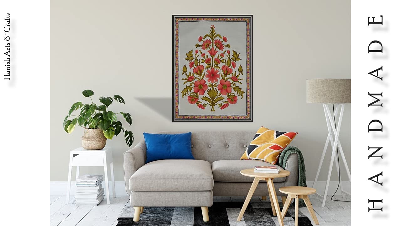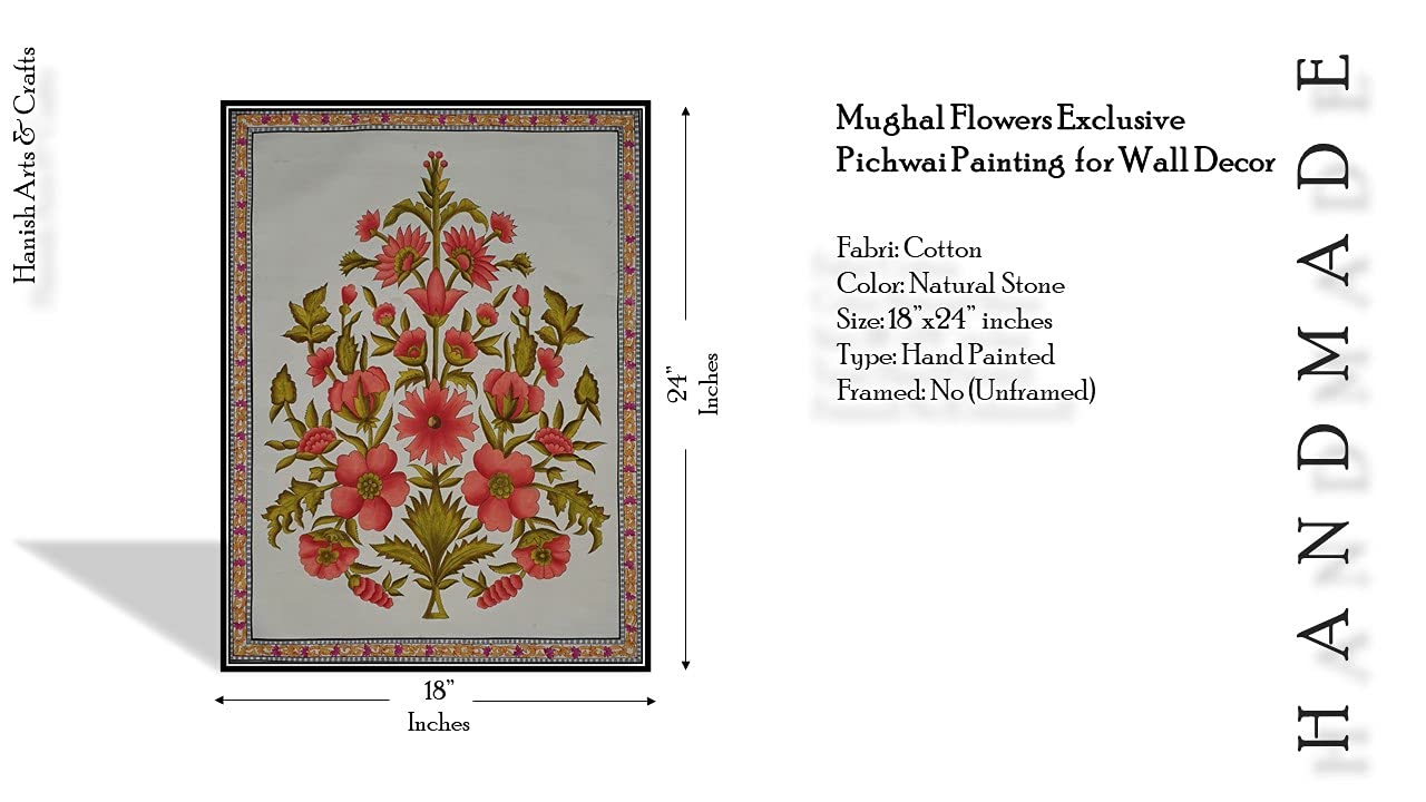 PICHWAI- PAINTED TEMPLE HANGING - Mughal Flowers - Hand Painted on Cloth. Overview a beautiful painting involves the action or skill of using paint in the right manner; hence the end product will be a picture that can speak a thousand words they say. Arts have been in trend for quite some time now. It can give different viewer different meanings style and design the saf wood matte abstract painting with frame is quite abstract and mysteriously beautiful. The painting has a nice frame to it. You can gift this to a family or a friend. The painting has various forms of certain figures on it as seen in the image. You can add a good set of lights to the place where the painting is and the decor will give a different feel and look to the place. Quality and durability the painting has a matte finish.