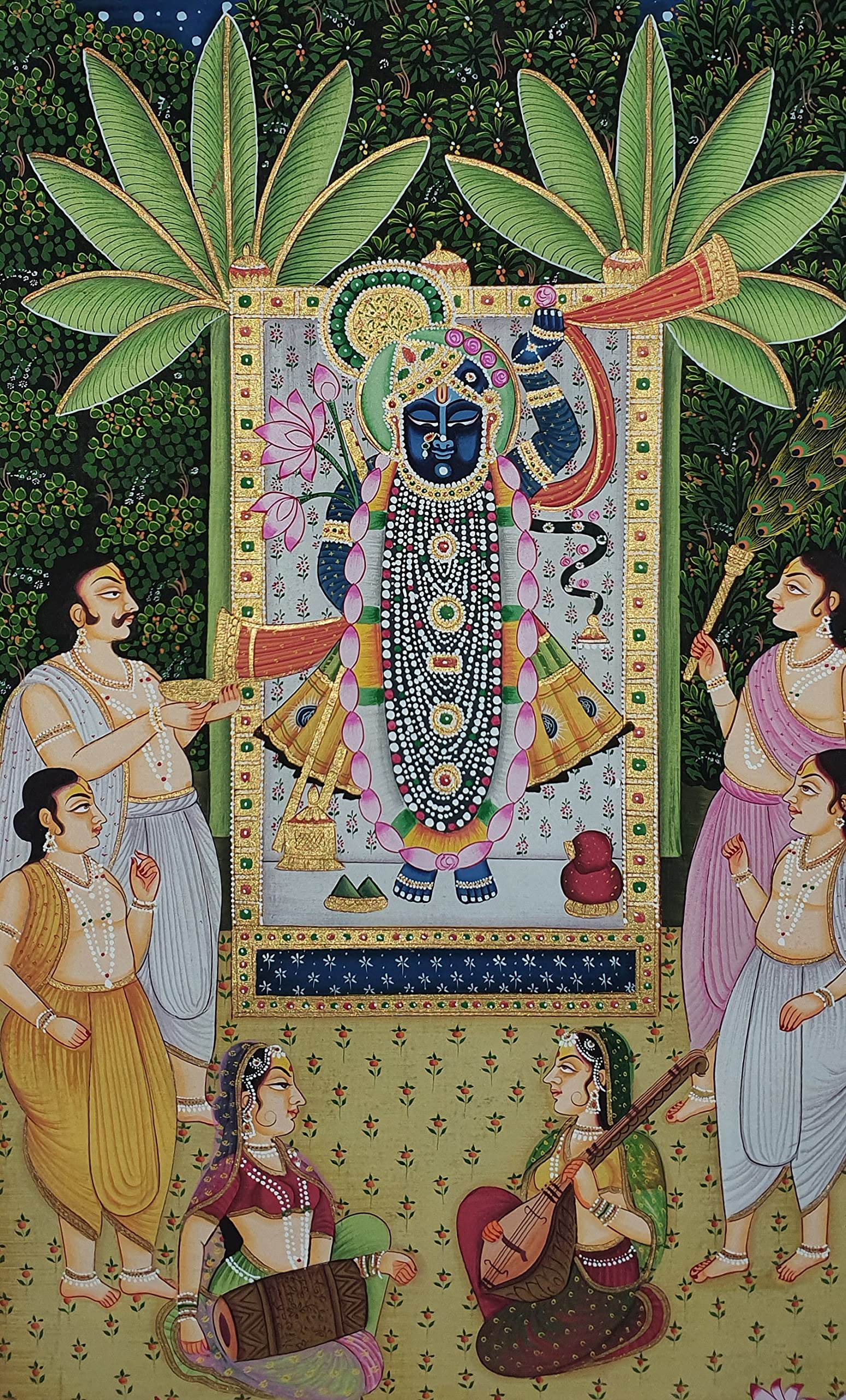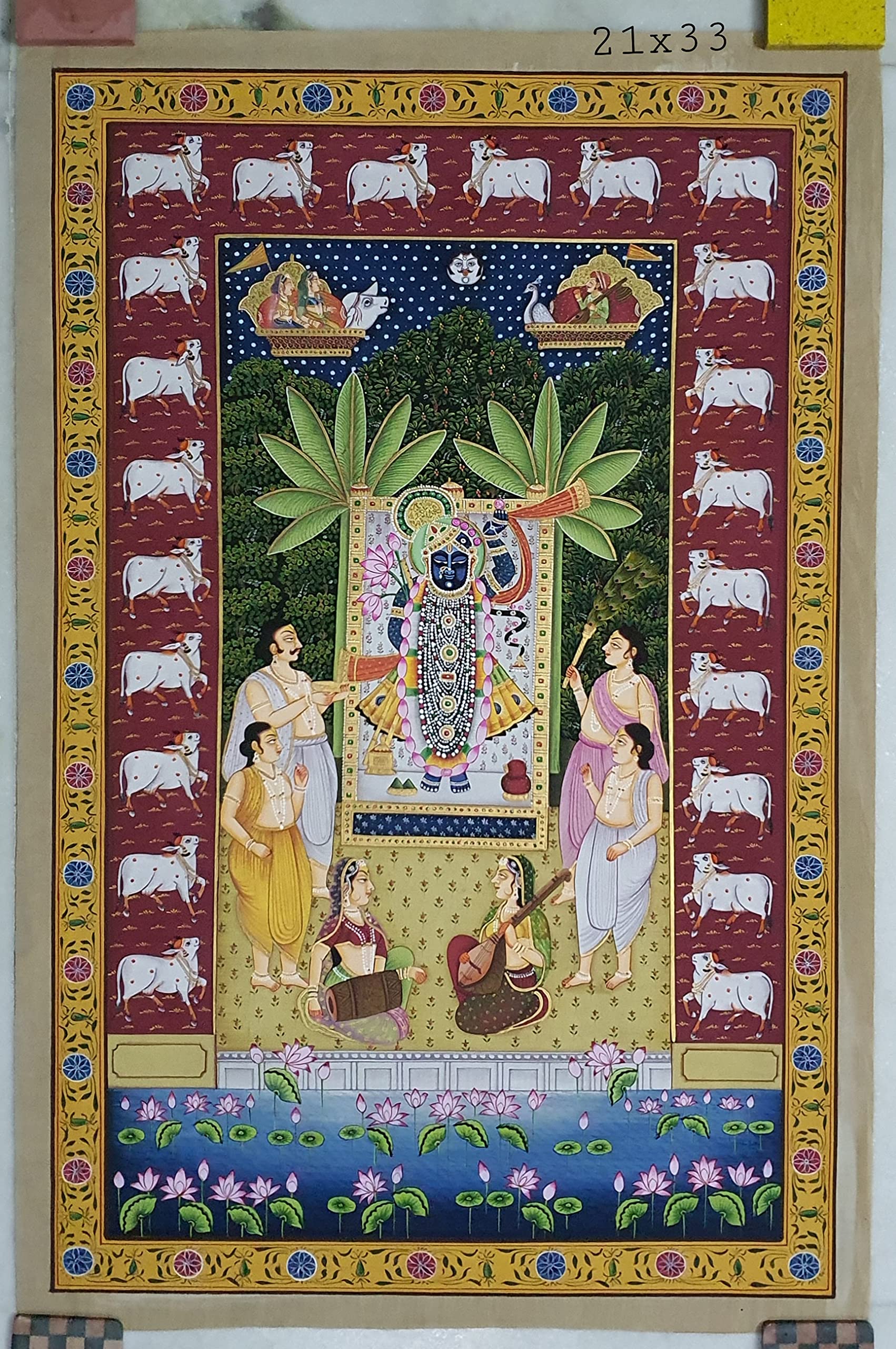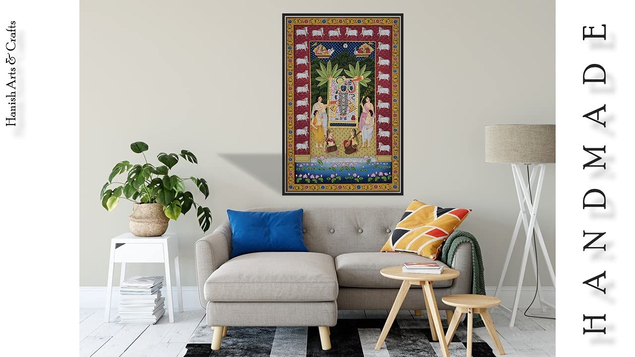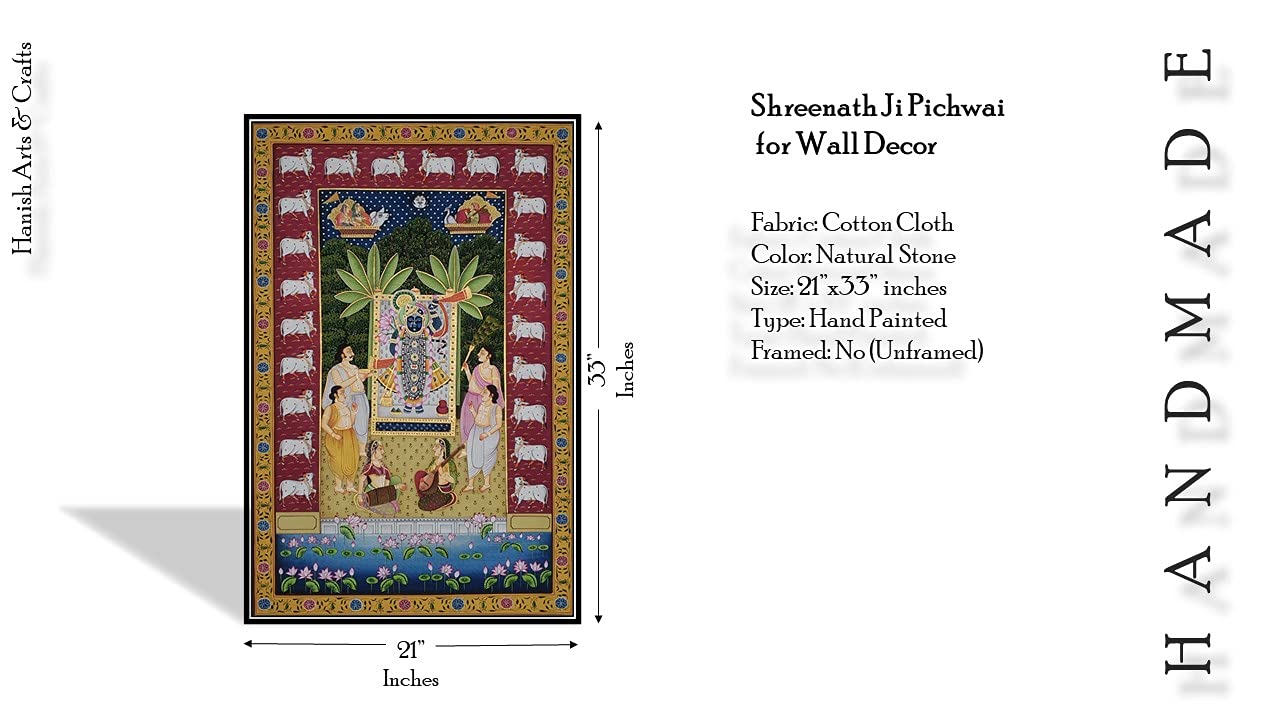 PICHWAI- PAINTED TEMPLE HANGING - Shreenath Ji Pichwai Painting - Hand Painted on Cloth (21x33 inches). overview a beautiful painting involves the action or skill of using paint in the right manner; hence the end product will be a picture that can speak a thousand words they say. Arts have been in trend for quite some time now. It can give different viewer different meanings style and design the saf wood matte abstract painting with frame is quite abstract and mysteriously beautiful. The painting has a nice frame to it. You can gift this to a family or a friend. The painting has various forms of certain figures on it as seen in the image. You can add a good set of lights to the place where the painting is and the decor will give a different feel and look to the place. Quality and durability the painting has a matte finish.