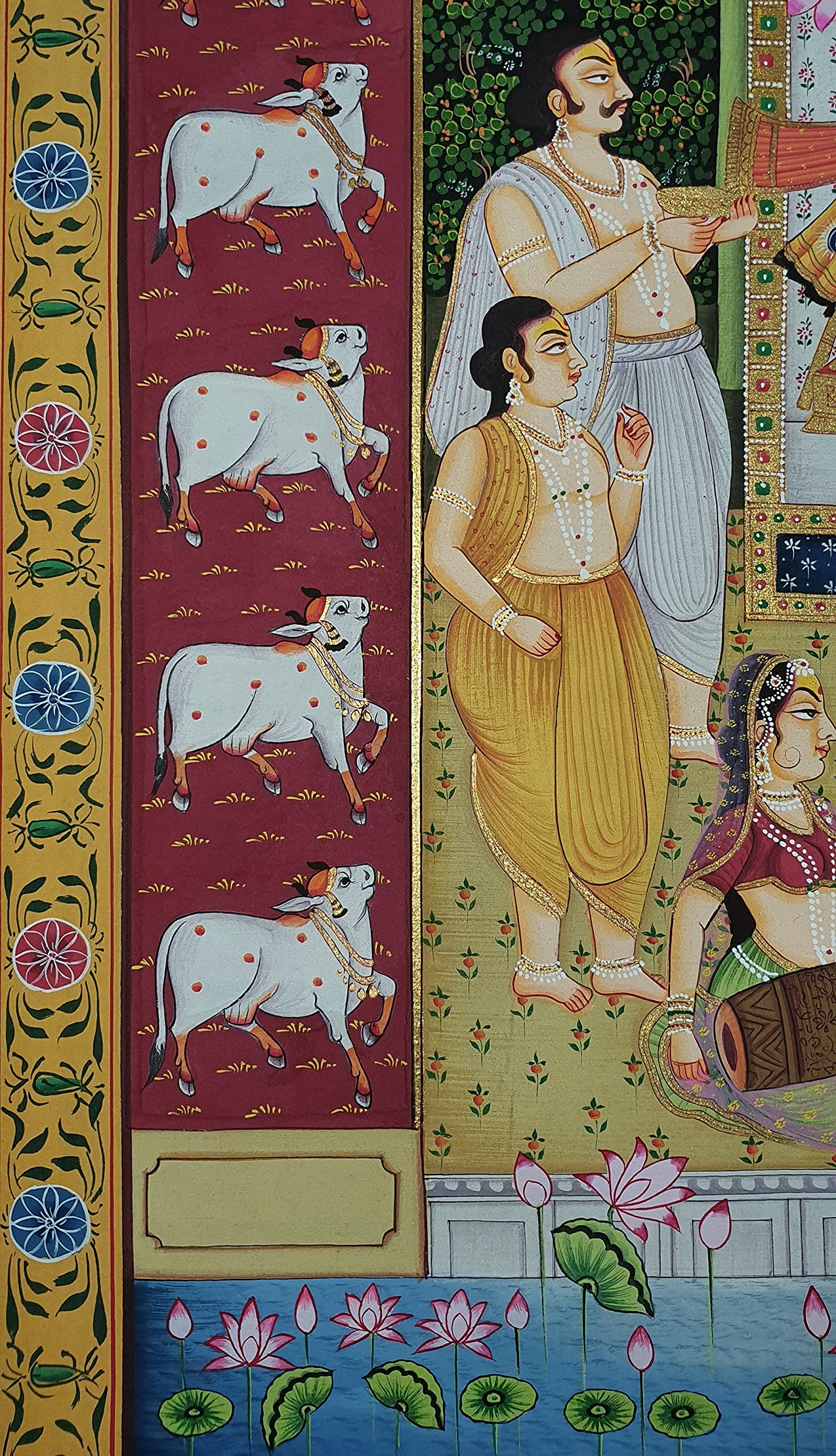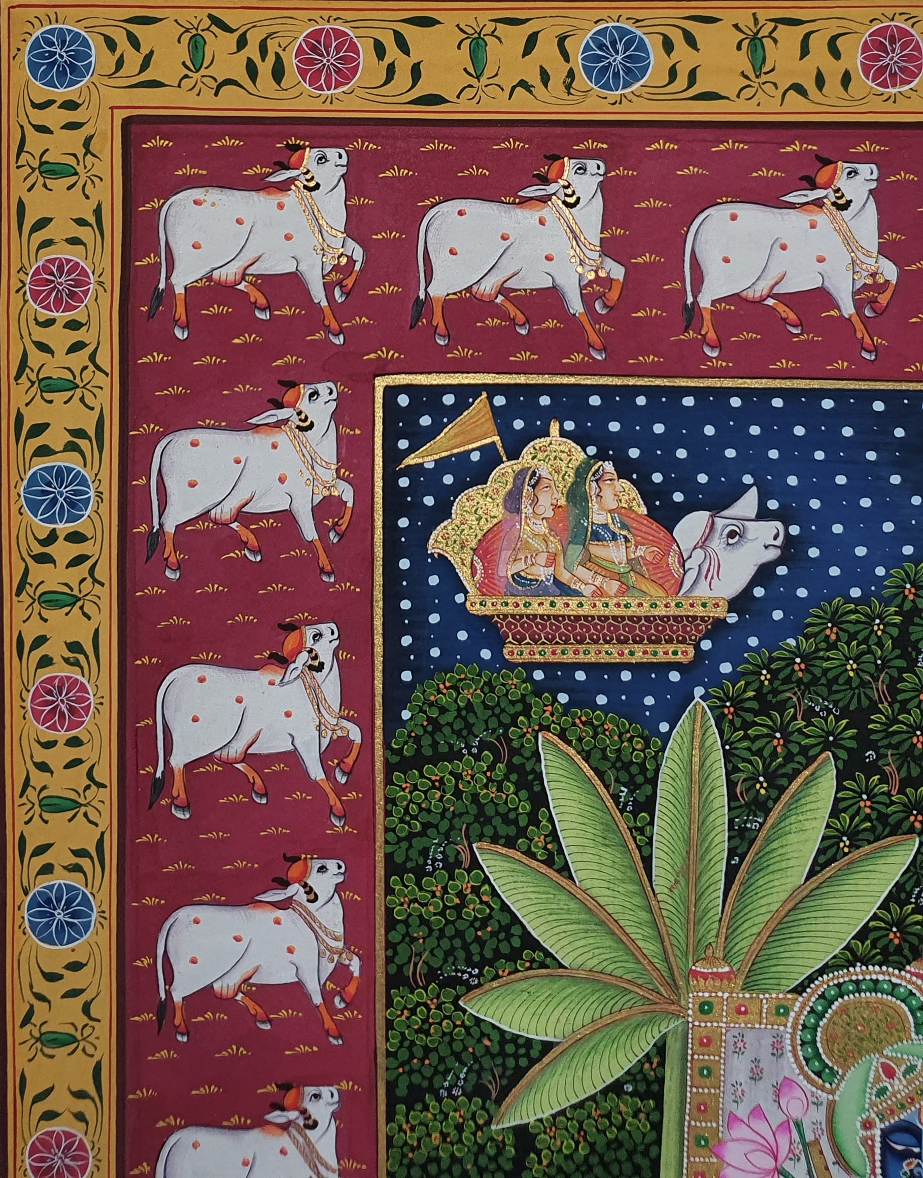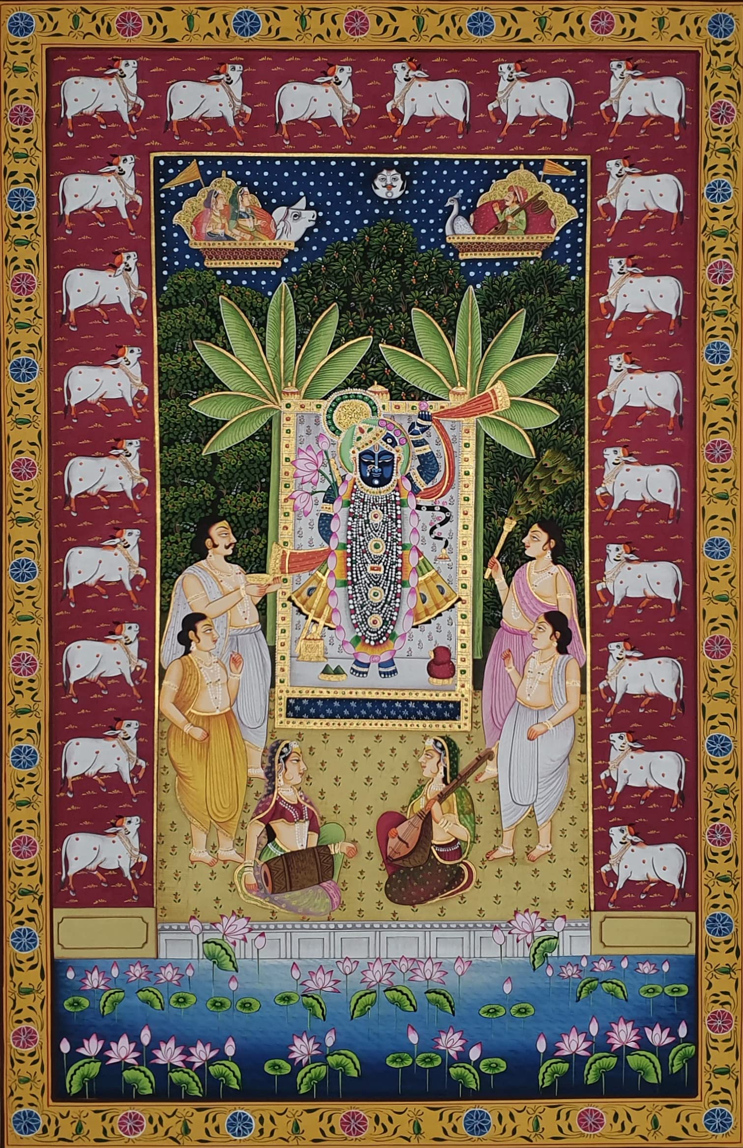 PICHWAI- PAINTED TEMPLE HANGING - Shreenath Ji Pichwai Painting - Hand Painted on Cloth (21x33 inches). overview a beautiful painting involves the action or skill of using paint in the right manner; hence the end product will be a picture that can speak a thousand words they say. Arts have been in trend for quite some time now. It can give different viewer different meanings style and design the saf wood matte abstract painting with frame is quite abstract and mysteriously beautiful. The painting has a nice frame to it. You can gift this to a family or a friend. The painting has various forms of certain figures on it as seen in the image. You can add a good set of lights to the place where the painting is and the decor will give a different feel and look to the place. Quality and durability the painting has a matte finish.