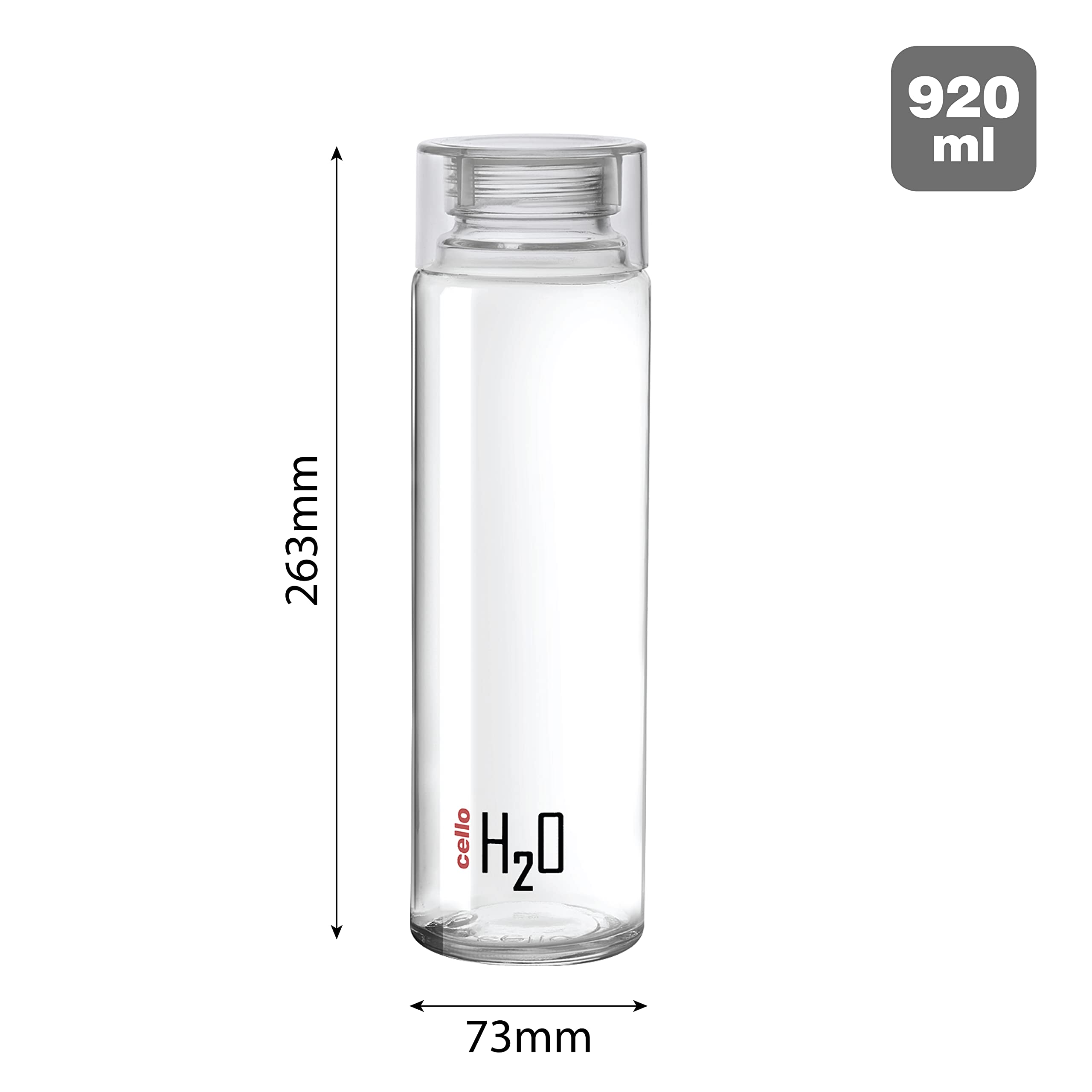 CELLO H2O Glass Fridge Water Bottle with Plastic Cap | Leak proof & break-proof | Wide mouth & Easy to Clean | Best Usage for Office/School/College | 920ml | Clear