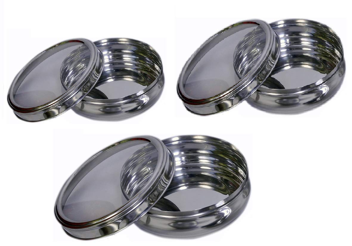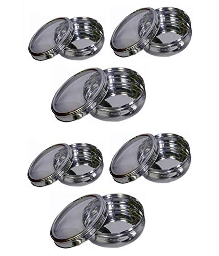 Elegant belly shaped stainless steel see through Poori dabba set of 6. It can be used for various purposes like cake, chocolates, It is safe for everyday use. Your new container set has no smelly odor and will store food with no BPA, toxic chemical or other chemicals that leach into food.