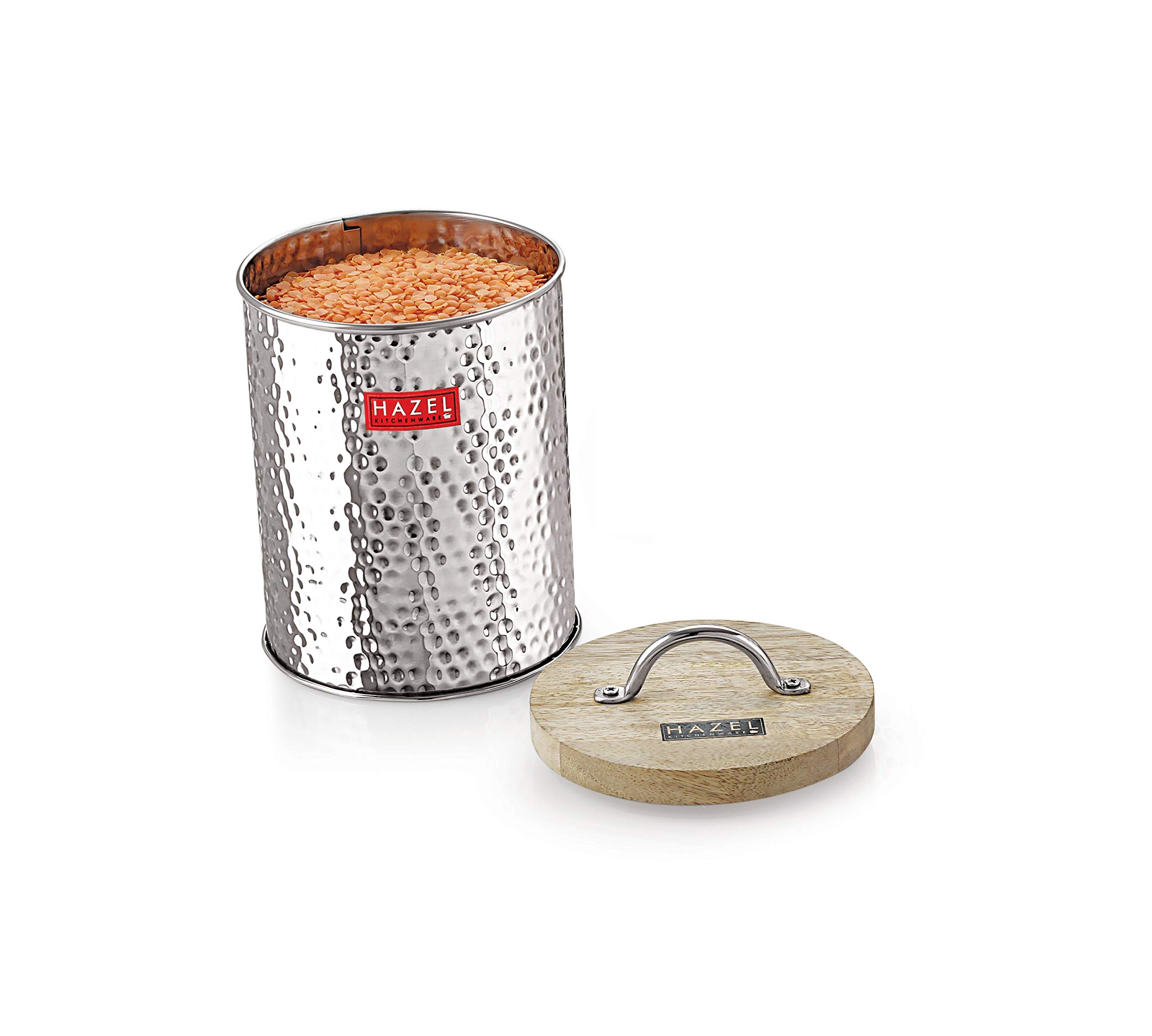 HAZEL Stainless Steel Hammered Finish Storage Jar Container With Wood Lid 1400 ML Silver