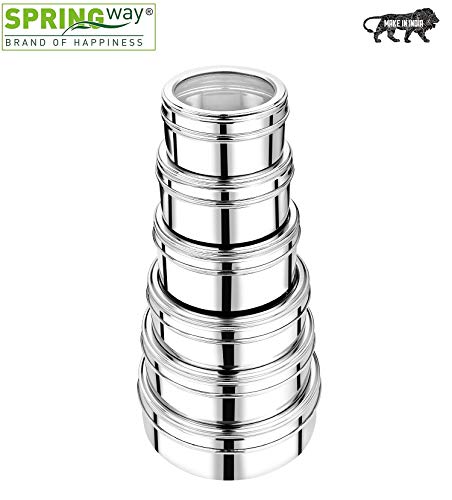SPRINGWAY - Multipurpose Stainless Steel Storage box. Idea for storing roti chapati snacks cake and what not. Stackable and multipurpose. Springway products are made from high quality quality checked to ensure that they just dont look good in images but in reality serve your need in reality. Product is made from superior quality Stainless steel which will not crack rust or pit. Product body is made from joint-less technology and hence will not leak or rust even in tough conditions. Product Content: Springway Stainless Steel 6 Puri Dabba's Capacity: 400ml 630ml 800 ml 1000ml 1200ml 1600 ml