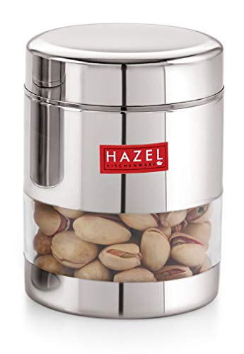 HAZEL Stainless Steel Transparent Glossy See Through Container Set of 4 Silver 500 ML Each Containers have a see through body looks like elegant and It is ideal for keeping a track of your food products. If you are looking for high quality & durable stainless steel storage Containers for storing Then we are offers you high standard stainless steel storage container which is perfect to meet your storing need. This highly durable stainless steel storage containers with stainless steel lid. Perfect for gifting purposes at weddings anniversaries. Hazel is one of the leading brand in household products. Hazel designs products as per the market trends with maintaining standard quality. Hazel have wide range of kitchenware products like containers bottles baskets jugs. plates bowls trays scissors knives spoons topes pali palati pans pots cookers flasks thermos lunch boxes etc. Hazel use the high quality material such as food grade stainless steel plastic melamine ceramic etc. all your cooking essentials and see the contents of the jar through a visible transparent see through window and check supply levels of food inside containers. Made from high quality food grade stainless steel container which ensures strength quality and durability.The modern design see through canister container is perfect for your beautiful home and kitchen. Airtight lids ideal for keeping out moisture.Ideal for multipurpose storing Tea Sugar Coffee powder Spices Dryfruits Biscuits Candies Namkeen & Cooking Essentials. Wash Care Instructions:- Wash with lukewarm water Do not scrub with scrubber Not for hot filling. Avoid the use of abrasive scrubbers.Product Dimension:- 8.5 X 8.5 X 11.5 Cm (L X B X H) Weight:- 190 Gms Capacity: 500 ML1 Year Manufacturer Warranty