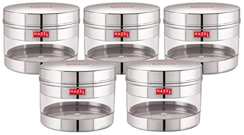 HAZEL Stainless Steel Transparent Wide Mouth See Through Container Silver Set of 5 500 Ml Containers have a see through body looks like elegant and It is ideal for keeping a track of your food products. If you are looking for high quality & durable stainless steel storage Containers for storing Then we are offers you high standard stainless steel storage container which is perfect to meet your storing need. This highly durable stainless steel storage containers with stainless steel lid. Perfect for gifting purposes at weddings anniversaries. Hazel is one of the leading brand in household products. Hazel designs products as per the market trends with maintaining standard quality. Hazel have wide range of kitchenware products like containers bottles baskets jugs. plates bowls trays scissors knives spoons topes pali palati pans pots cookers flasks thermos lunch boxes etc. Hazel use the high quality material such as food grade stainless steel plastic melamine ceramic etc. all your cooking essentials and see the contents of the jar through a visible transparent see through window and check supply levels of food inside containers. Made from high quality food grade stainless steel container which ensures strength quality and durability.The modern design see through canister container is perfect for your beautiful home and kitchen.Ideal for multipurpose storing Tea Sugar Coffee powder Spices Dryfruits Biscuits Candies Namkeen & Cooking Essentials. Wash Care Instructions:- Wash with lukewarm water Do not scrub with scrubber Not for hot filling. Avoid the use of abrasive scrubbers.Product Dimension:- 10 x 10 x 9.25 cm (L x B X H) Weight:- 170 Gms Diameter:- 10 cm Capacity:- 500 ML. (Rice Capacity:- 400 gm apx.)3 Months Manufacturer Warranty