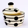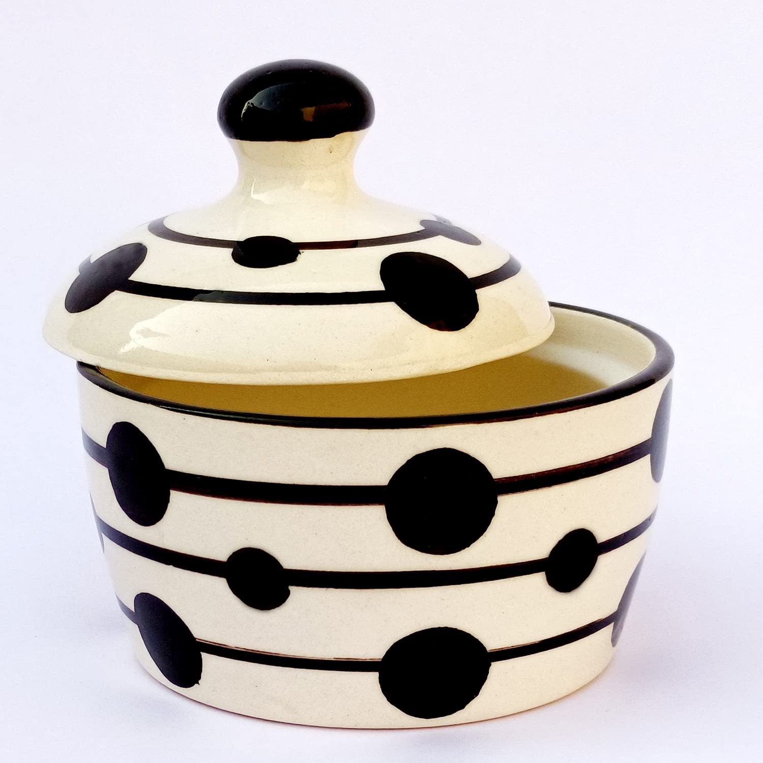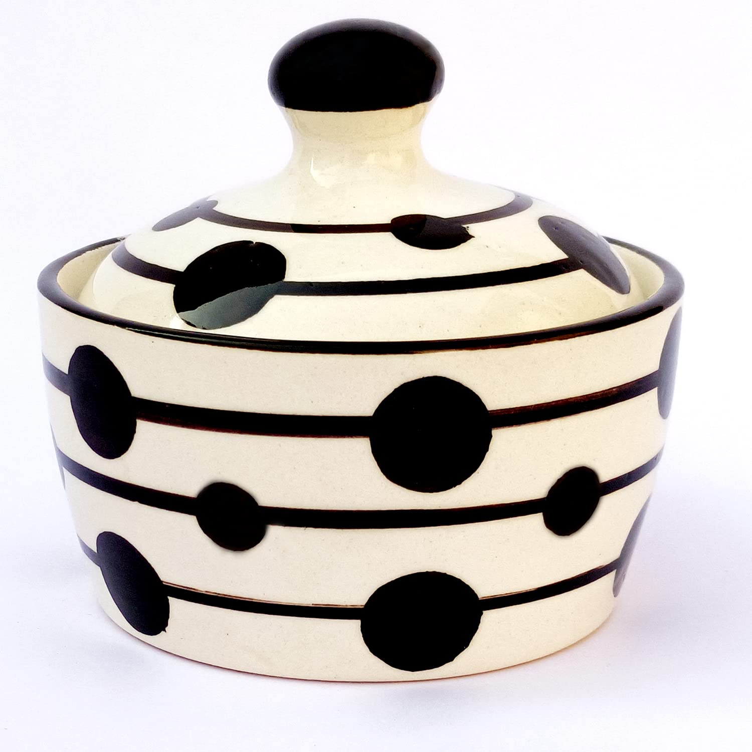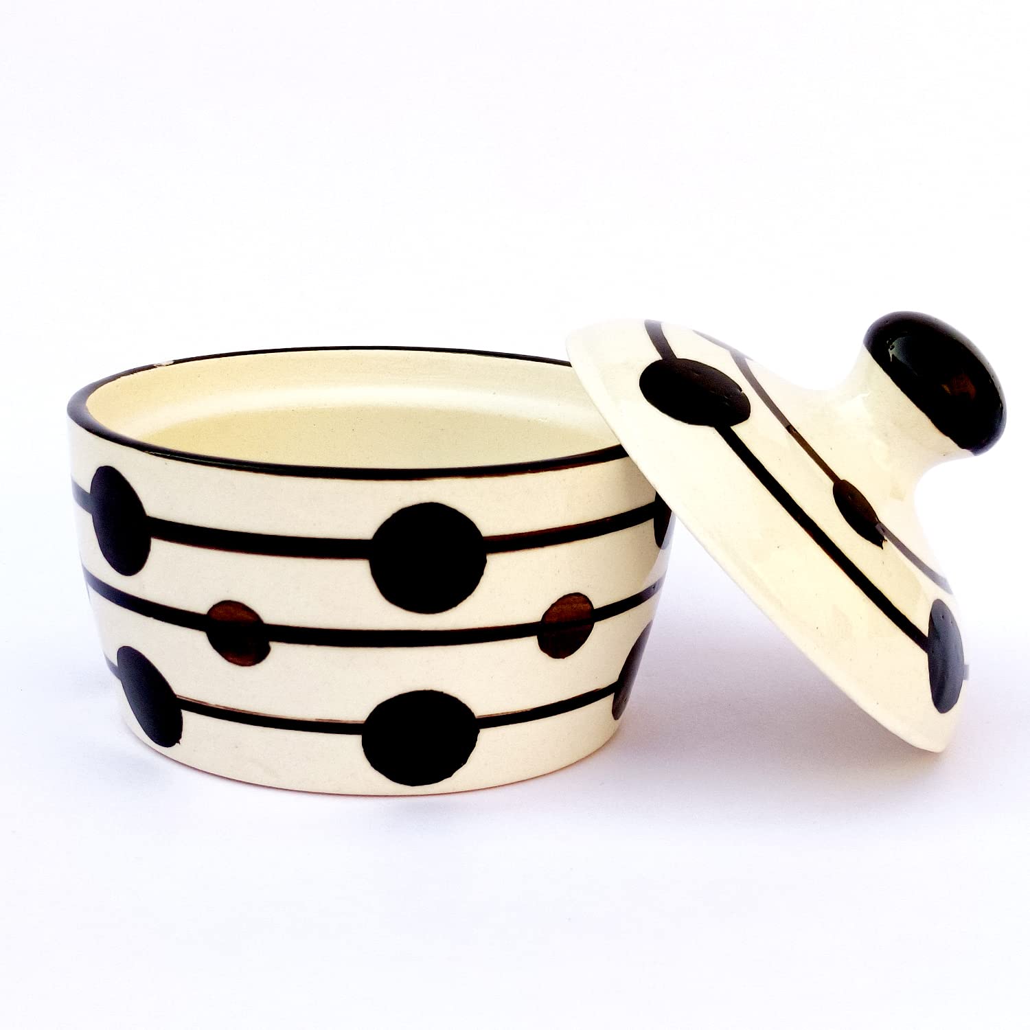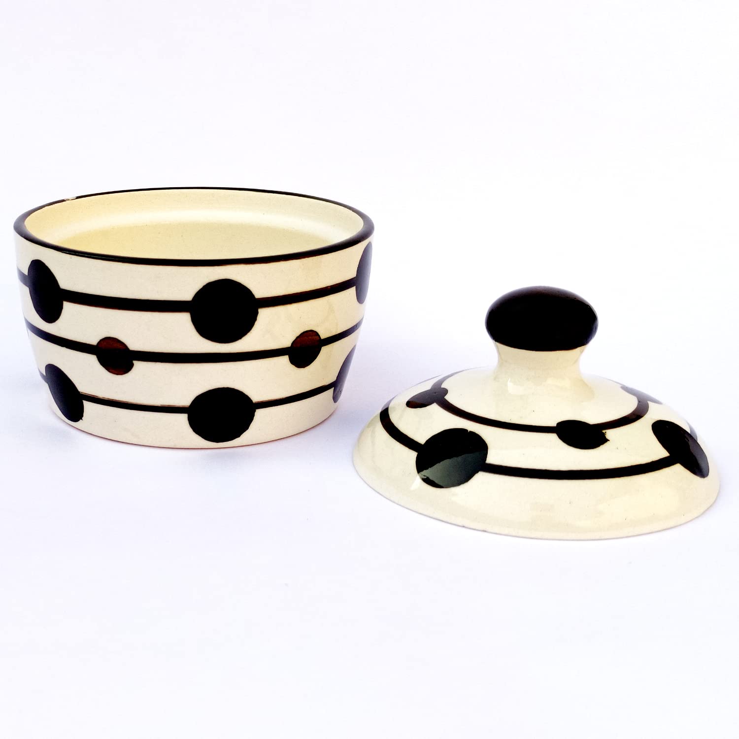KHURJA POTTERY manufactured this elegant Hand-painted butter pot keeps the butter fresher for longer and at the right consistency for spreading on crusty bread or baked potatoes for morning toast or evening dinner rolls. It is also perfect for keeping the butter at room temperature for everyday use. This pot is constructed from stoneware a high quality ceramic material. Its finish and amazing mat finish ensures that this pot will blend in beautifully with any type of surrounding you may have. Whether you are running a catering company a sit-down restaurant or buffet this butter pot is a beautiful and necessary accessory. Butter has never looked better than when neatly displayed in this dish. It adds pure elegance and sophistication to your table decor with its modern design. Can also be used for storing and serving chutneys and pickles besides butter.