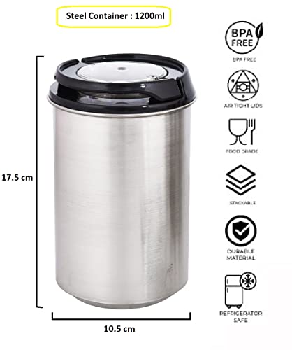 Machak Steel Airtight Containers Set for Kitchen Storage, 1200ml (Black, Set of 6)