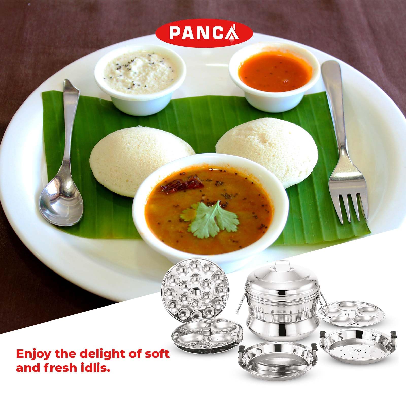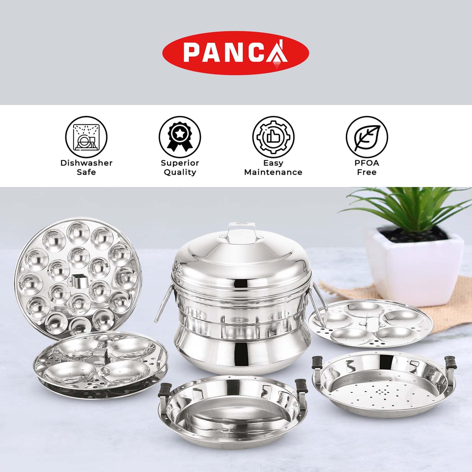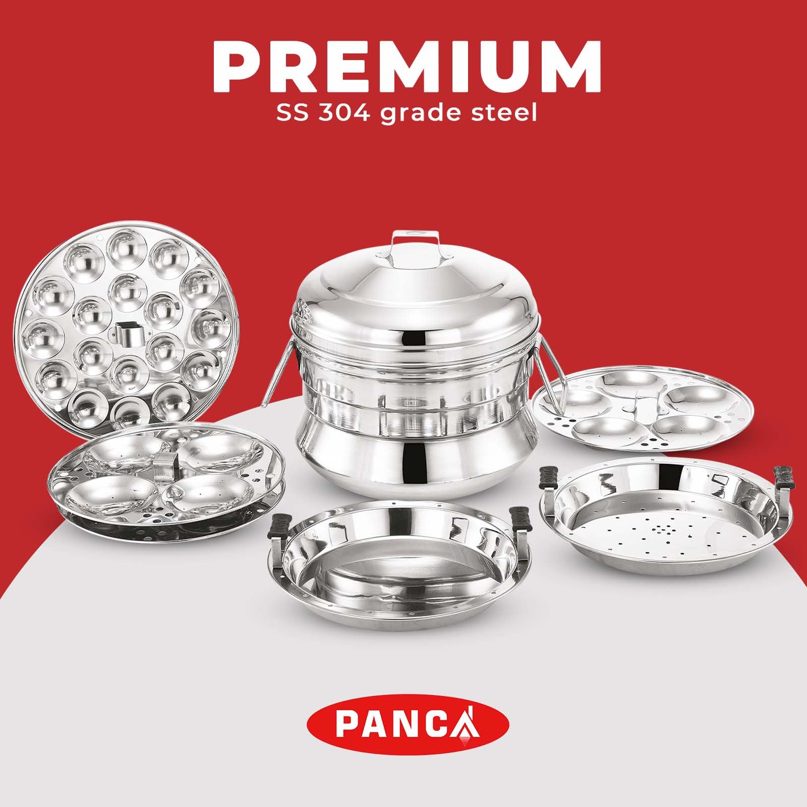 PANCA Idli Maker 6 Plates, 3 Idli Plates, 1 Mini Idli Plate, 1 Dhokla Plate, 1 Steamer Plate, Stainless Steel Idli Panai - Multipurpose (13 Idli, 18 Mini Idli), 15 Liters
