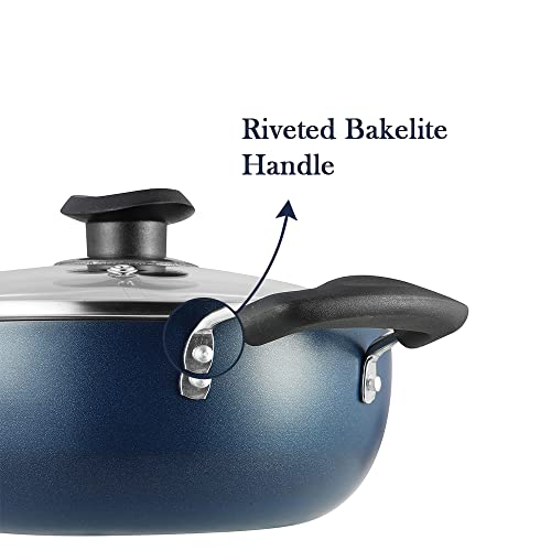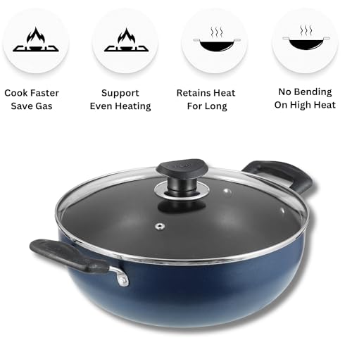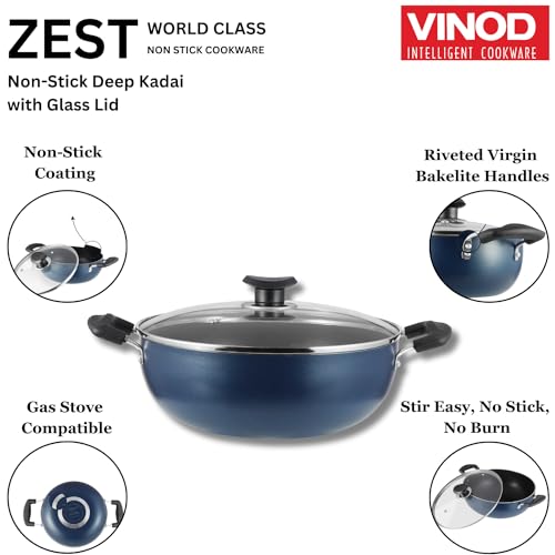 This Vinod non stick deep kadai with glass lid has a thick aluminium which ensures faster and burn free cooking. It is must have in your kitchen. Deep spacious kadai for comfortable and mess-free cooking. You can make your food healthier with the help of this non-stick kadai as it consumes less oil. It comes with glass lid which makes you cook faster and keeps your food warm. The lid also has a steam release vent. This deep kadai is equipped with heat resistant riveted handles which allow for easy handling in the kitchen without coming off loose over time. The deep kadai is designed for modern kitchens and appliances. It is both gas stove and induction compatible. It is ideal for sauteing vegetables cooking meat and gravy and deep-frying . It is free from PFOA heavy metals and harmful chemicals. So much better than cheap coatings that peel off and lose effectiveness within a few months of use. The non stick coating helps prevent cooked food from adhering to the kadai; instead food effortlessly transfers to a platter or dinner plate for gracious serving. It comes with a 12 months warranty; terms and conditions apply.
