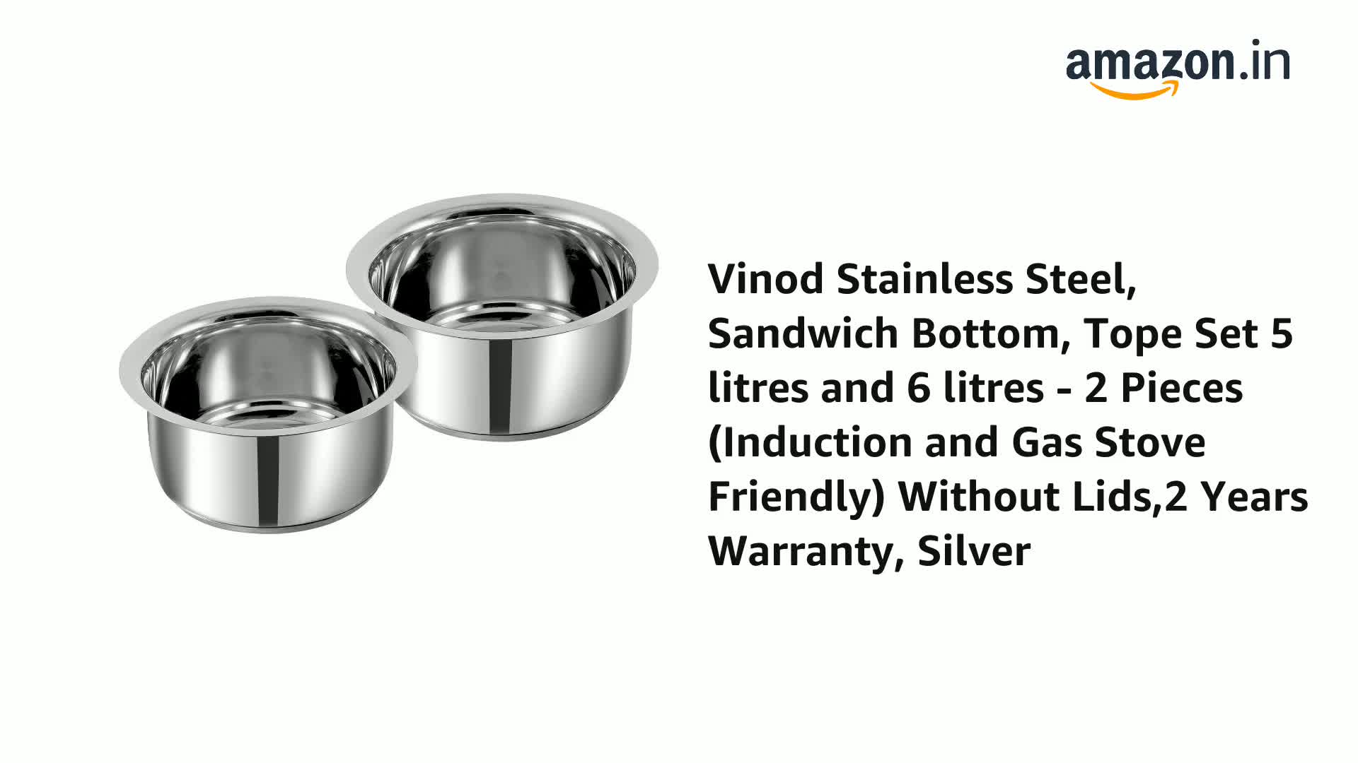 The Vinod Stainless steel tope set of 2 contains collection of tope / vessels of various sizes hence taking care of all your kitchen needs. Compaq size makes it easy to store in kitchen cupboards. When not in use stack the smaller container inside bigger containers saving storage space. Box Dimension - L X W X H (cms): 29 x 29 x 14.7. Weight -2.52kg Size: 17- Capacity in Liters- 5ltr. Size: 18 - Capacity in Liters- 6ltr