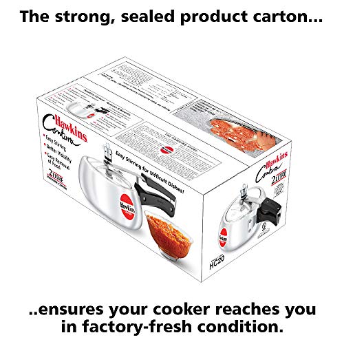 The Hawkins HC20 Contura 2 Liters Pressure Cooker is a perfect addition for every kitchen. It is designed with a unique body that has rounded sides for easier stirring better visibility and easy removal of food. This Hawkins Contura Pressure Cooker has 2 liters capacity and is made of aluminum material. It is ideal cooking for 2-3 persons. The flat base measures 1.4 mm in diameter and 3.25 mm in thickness. The handles provide perfect grip while holding it. Buy the Hawkins HC20 Contura 2 Liters Pressure Cooker and enjoy your daily cooking with great comfort!.