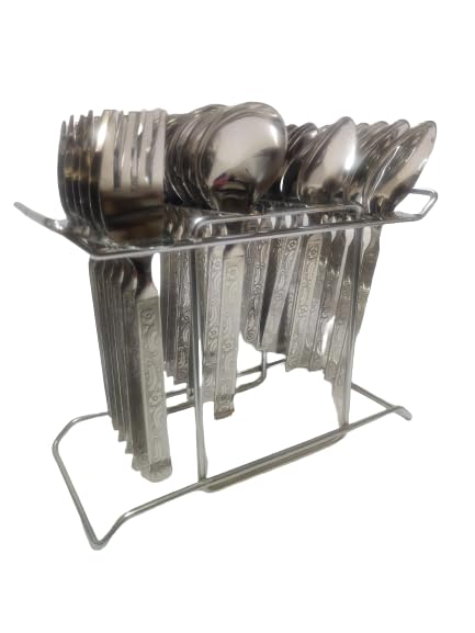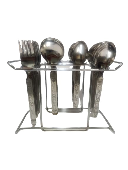 24 pcs Stainless steel cutlery set with stand Easy to clean & elegant design spoon set makes it ideal for daily use Contents: 6 dinner spoons 6 fork spoons 6 soup spoons 6 baby spoon and standDesign on spoons and forks gives it a rich and clean look comfortable to hold. Smooth edges for safety perfect spoons sets for your dinner table Made from food grade stainless steel to prevent rusting Product Dimension- Stand- 20x15 cm Spoon- 3.5x17 cm Fork- 2.5x16.5 cm Soup- 4x16 cm Baby- 3x13 cm