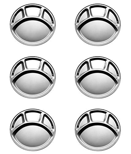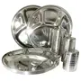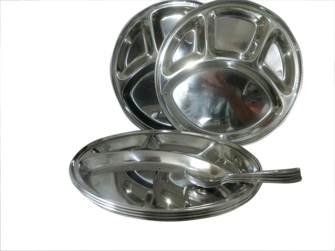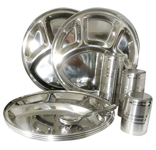 This set has been beautifully designed to add grace to your dining experience. It is easy and fun even for the picky eaters. This stainless steel plate has 4 section divided parts so you can separate dishes while serving everything in one plate. It is perfect for introducing a balanced diet and new foods. This stainless steel plate with compartments can also used in mess, halls, parties, pantry, canteen, schools, collages, hotels, restaurant and other services. This divided plate for kids has separate compartments to prevent food from sliding and mixing. This stainless steel dinner plate is great for holding rice, salad, vegetable or other food. Great for home, camping, picnic. This plate is washable and reusable.This plate can be carried outside conveniently. Too often eating outdoors or with young children means breaking out the disposable plates that won't break, usually this means turning to plastics or throw-away paper plates. All dishes can be served together in one plate. Inside or outside - these platters make meal time neat. Make your meal time easier by yourselves. With galss set is perfect for serving lemonade, water, juice etc.These Glasses can be used at home as well as at Hotels and restaurants. These can be easily cleaned and maintained.With also teaspoon, dessert spoon, the table spoon of durability and utility. it has a multipurpose use and can be used for serving fruits, snacks and dinner