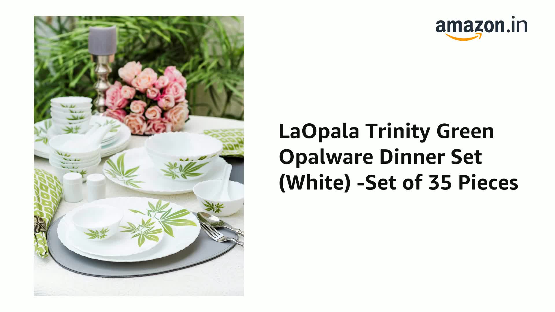 LaOpala Trinity Green Opalware Dinner Set (White) -Set of 35 Pieces