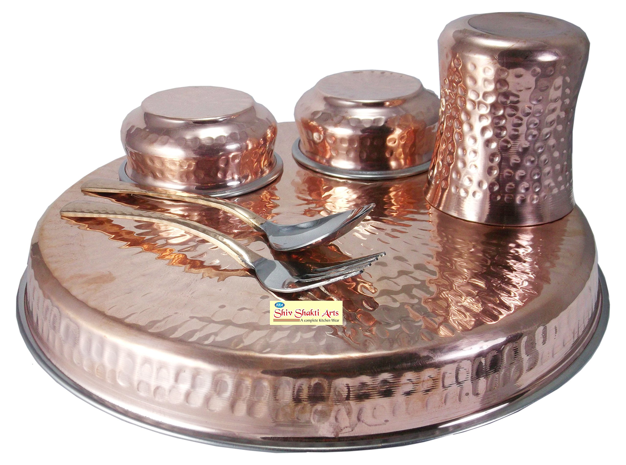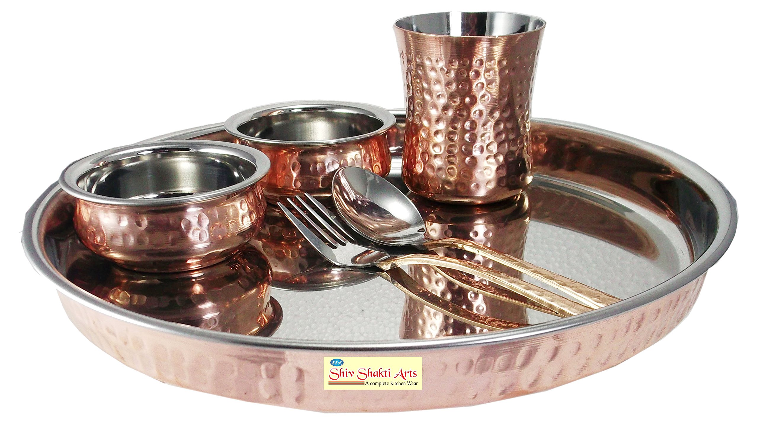 SHIV SHAKTI ARTS Stainless Steel & Copper Traditional Kitchen Dinner Set of 6 Pieces 1 Plate Thali 2 Handi Bowls 1 Glass 1 Fork 1 Spoon