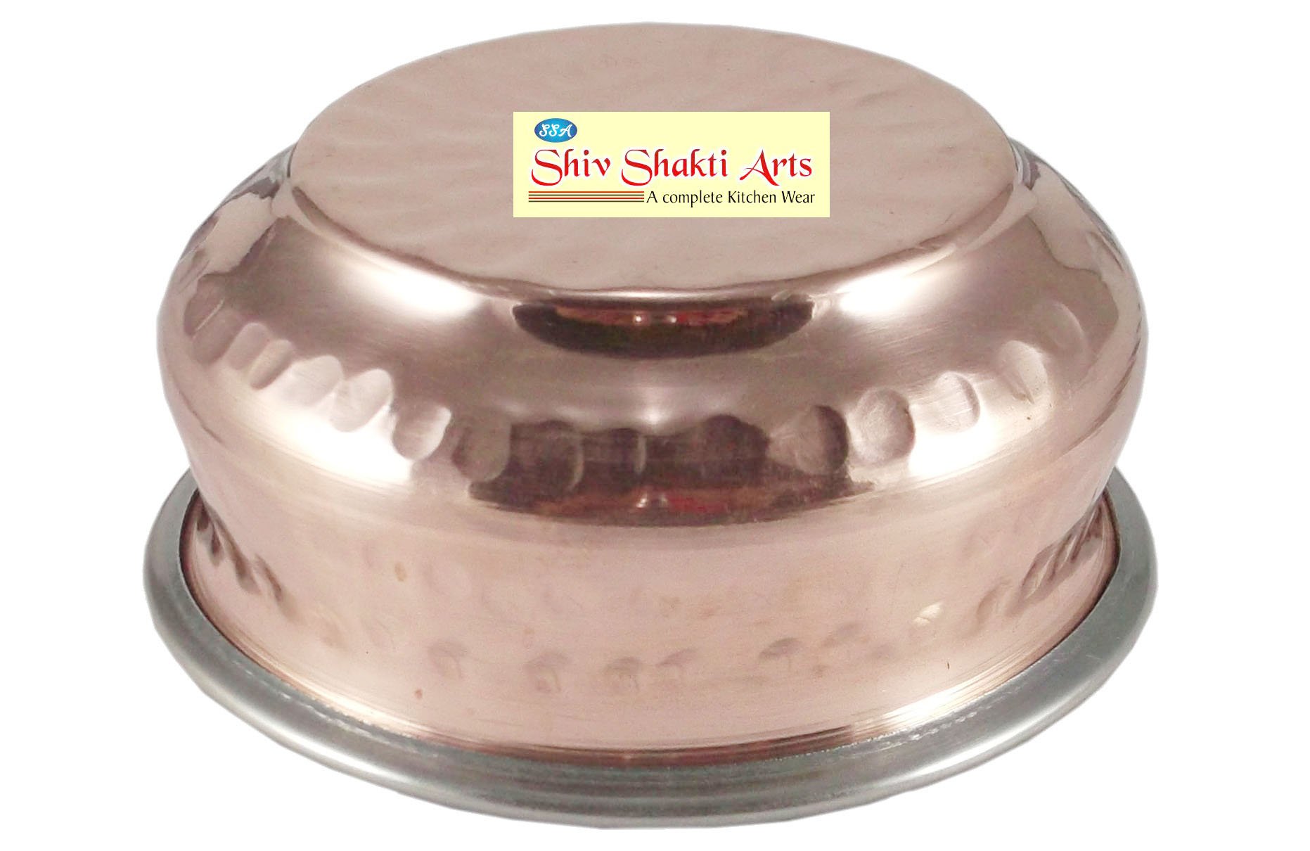 Relish Indian cuisine in Indian style! This is a set of centerpiece serve-ware for Indian food. Serve Indian dishes to your friends and family in this unique and ethnic looking centerpiece serve ware. With this serving utensil set your Indian style dining experience goes several notches up. The material used is food grade. Hammered Copper is used only on the outside of the utensil and does not come in contact with the food. Only the high quality food grade stainless steel is in contact with the food. Two layers of metal with air cushion ensure that the food stays warm much longer. Serving dinner in this dinnerware handi would be unforgettable experience. Care Tips a) Clean your copperware by hand and avoid dishwasher as the detergent can cause oxidation leading to permanent damage. b) Use a solution of equal quantities vinegar or lemon juice and salt diluted with some water at such times but don't use it regularly. c) Avoid scratchy cleaners like steel wool. d) A simple soft cleaning liquid on soap base hot water and a soft washing cloth is best for daily use. e) Use Copper Shining Powder for cleaning the copper utensils. Completely safe and gentle on hands. f) Copper Utensils Tarnish from time to time. This is Normal for an Authentic Copper utensils. ; Many Customers Love the Vintage/Antique Tarnished Look but Care Instructions for Minimizing and Removing Tarnish are Provided with Order