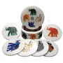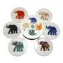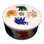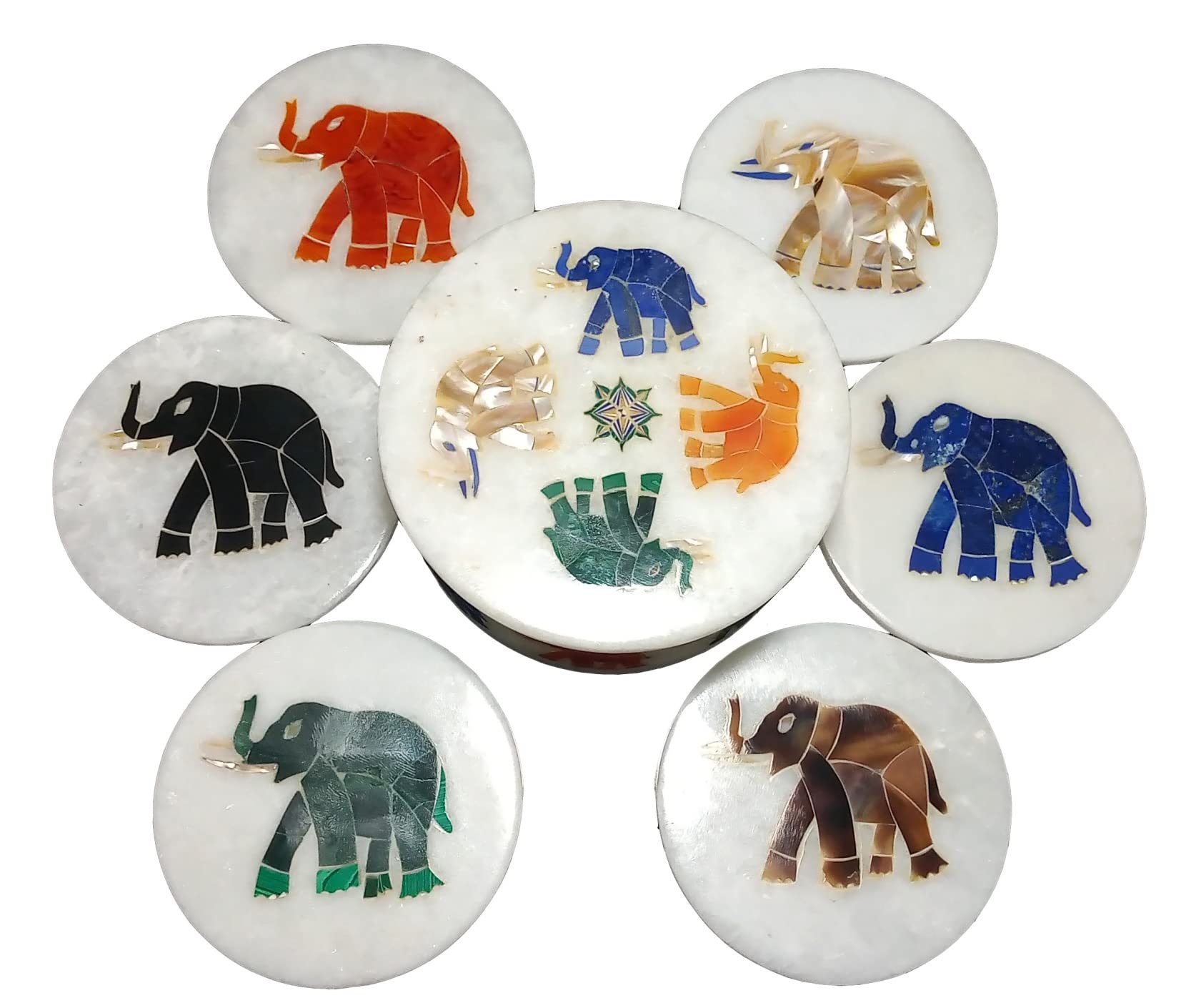 MARBLE INLAY ART AGRA - PACCHIKARI Exclusive Designer Coaster Set With Extra Top To be Used As a Mug Holder. It is made in Agra India & fully handmade by using different color of semi precious gems stone not a color and its 100% inlay so will remain as it is forever. We will send you a paper with description and Meaning of the stone. It is an art piece which will be a beauty & the conversation piece at home. Package Contains - 6 pieces Coaster tile + Container+ Top of Coaster+ Wooden Stand( total - 9 Item ) To maintain this art piece simply clean it with soap water and dry cotton cloth. Stone Inlaid In the Box Are Given Below : Lapis- Lazuli - Blue. Malachite - Green. Carnelian - Orange. Mother of Pearl - White. BLack Pearl - Brown. Black Onyx - Black. We are himself manufacture of this product so we do custom design and bulk order Too According to your Shape color and Size.