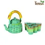 • Set contains Kettle 6 Glasses & a Holder for glasses. The kettle has a capacity of 1 Litre & each glass can have a serving of around 90ml. Kettle is of standard size (base diameter-5.5 inches height-8.5 inches) made of Aluminium.