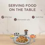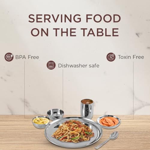 A multipurpose dinner/lunch set that can be used for home offices and restaurants. The 6 pcs stainless Steel set has all the required utensils. Durable dependable and economical the Stainless steel Dinner sets is perfect for use at home or even for gifting purposes. Made of high quality Stainless steel the Kraft dinner set is safe and hygienic to be used to eat on. Safe for use by kids the stainless steel dinnerware is unbreakable and shatterproof. Easy to clean and maintain the stainless steel Dinner set is the server's delight. It is an excellent choice if you want to replace your current dinner set with a trendy and contemporary one. Featuring a highly attractive design this lunch/dinner set will surely impress your lunch and Dinner guests while providing a great canvas to showcase your delicious food. Kraft aims to provide good quality products to customers so that they are always satisfied. You have made Kraft a part of your family and we want to strengthen this relationship by serving you better. Our products will help make household chores a breeze saving you time and energy to spend with your loved ones. As stylish as our products look we never compromise on the material they are made of. This product is made of 100% food grade stainless Steel with zero toxics. For the quality that they serve you Kraft products demand minimal maintenance. The stainless Steel surface can be wiped squeaky clean with a wet sponge or a cloth. It can even be used in a dishwasher. Keeps your food uncontaminated with its BPA free thermo-steel that is durable. All components are 100% food grade and non toxic. BPA free materials resists the growth of bacteria. This can be used as gifting options for your relatives or friends on their special occasions like marriage house warming ceremony and other events. 2 Year Warranty