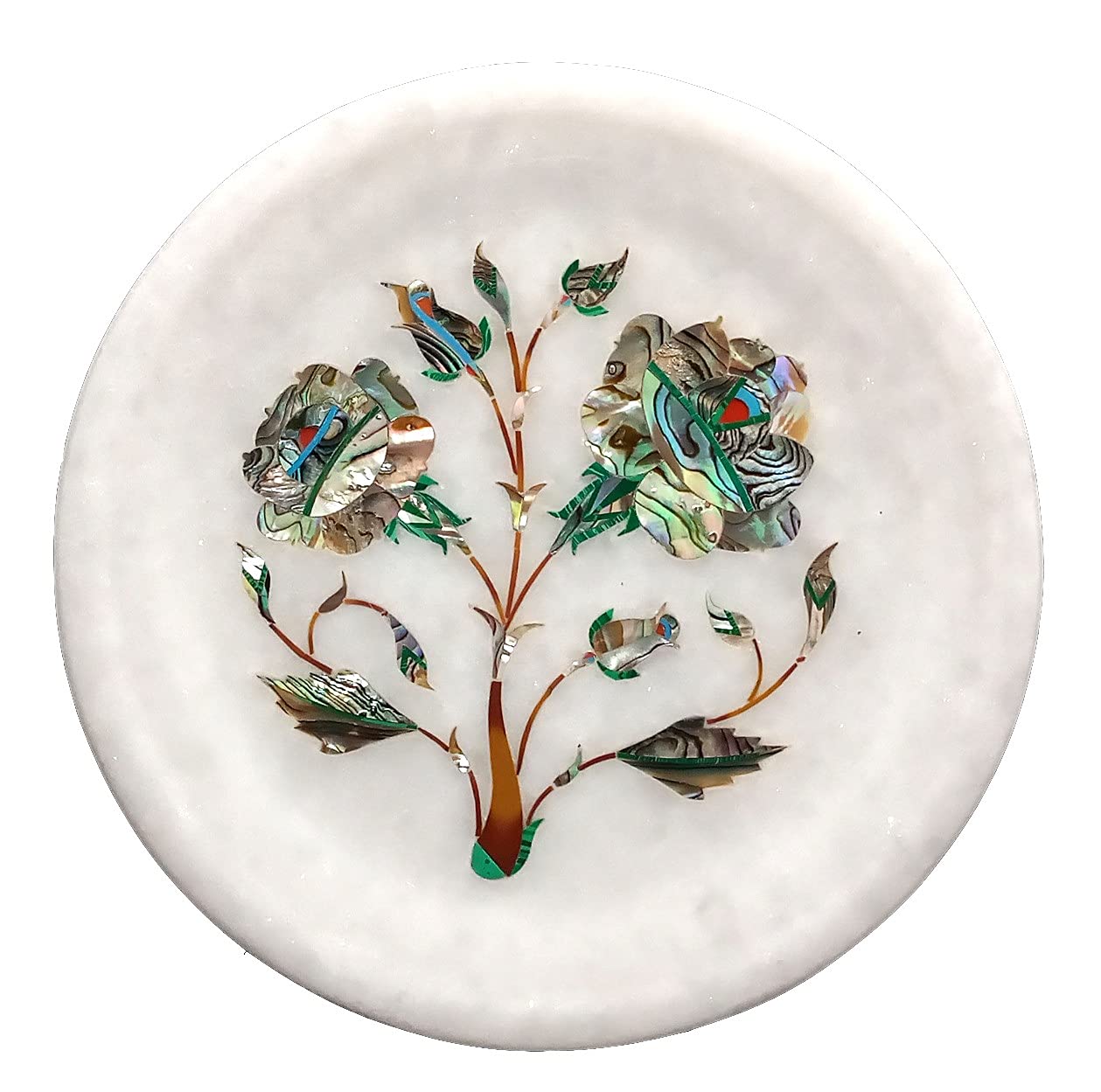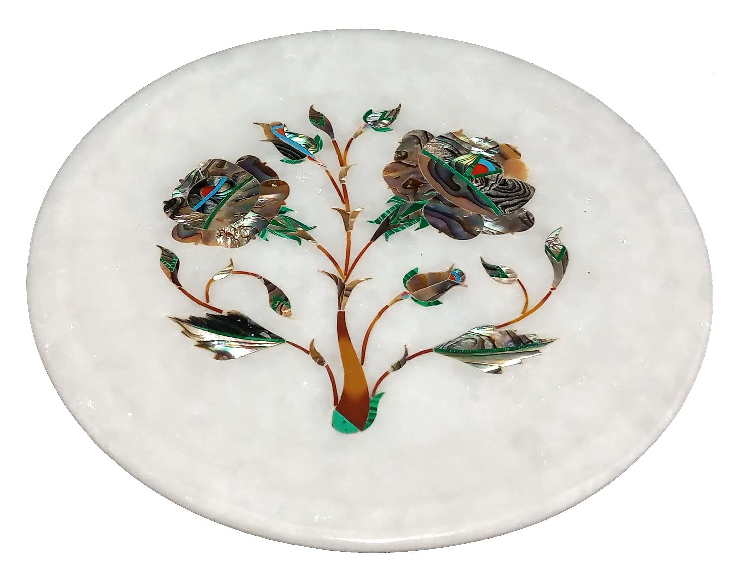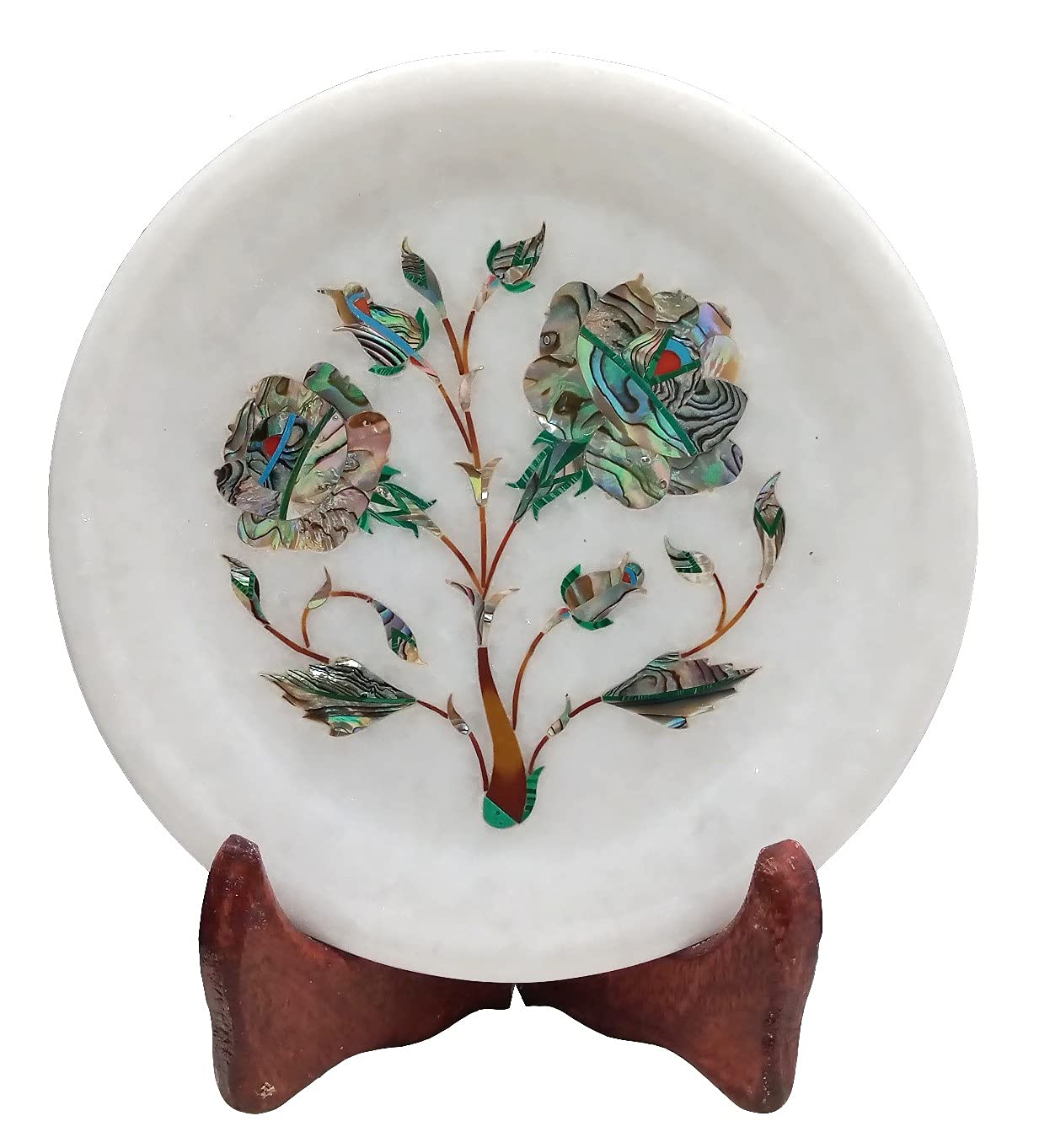 The White Marble Inlaid Plate is made in Agra India & fully handmade with inlay stone not a color or paint. MARBLE INLAY ART AGRA - PACCHIKARI Handcrafted White Marble Plate Perfect for Office Home and Hotel Decoration. Design: Floral with tree of life.. We will send you a paper with description and Meaning of the stone . We will send you wooden stand also to display. We are himself manufacture of this product so we do custom design also according to your color size and shape and bulk order too. To maintain this art piece simply clean it with soap water and dry cotton cloth. It is an art piece which will be a beauty & the conversation piece at home and perfect example of make in India. Stone are inlaid in the Plate Are Malachite - Green. Carnelian - Orange. Jasper - Brown. Turquoise - Light Blue. Pauch Shell - Colorful Shiny. Lapis Lazuli - Dark Blue.