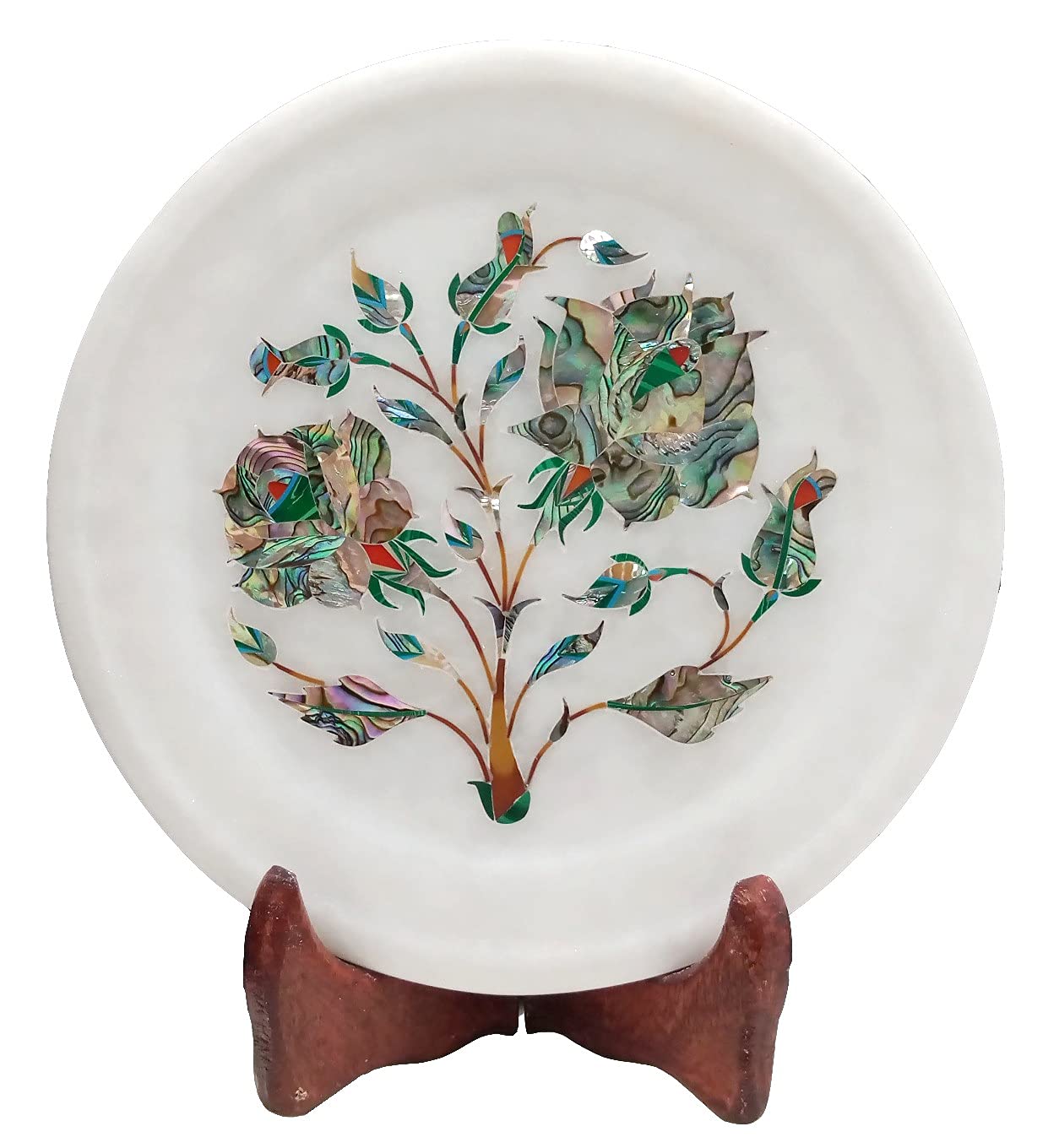 The White Marble Inlaid Plate is made in Agra India & fully handmade with inlay stone not a color or paint. It is a Beautiful Design Decorative Art piece from the City of Taj Mahal. Design: Floral with tree of life.. We will send you a paper with description and Meaning of the stone . We will send you wooden stand also to display. We are himself manufacture of this product so we do custom design also according to your color size and shape and bulk order too. To maintain this art piece simply clean it with soap water and dry cotton cloth. It is an art piece which will be a beauty & the conversation piece at home and perfect example of make in India. Stone are inlaid in the Plate Are - Pauch Shell - Colorful. Malachite - Green. Carnelian - Orange. Jasper - Brown. Turquoise - Light Blue. Mother Of Pearl - White.