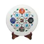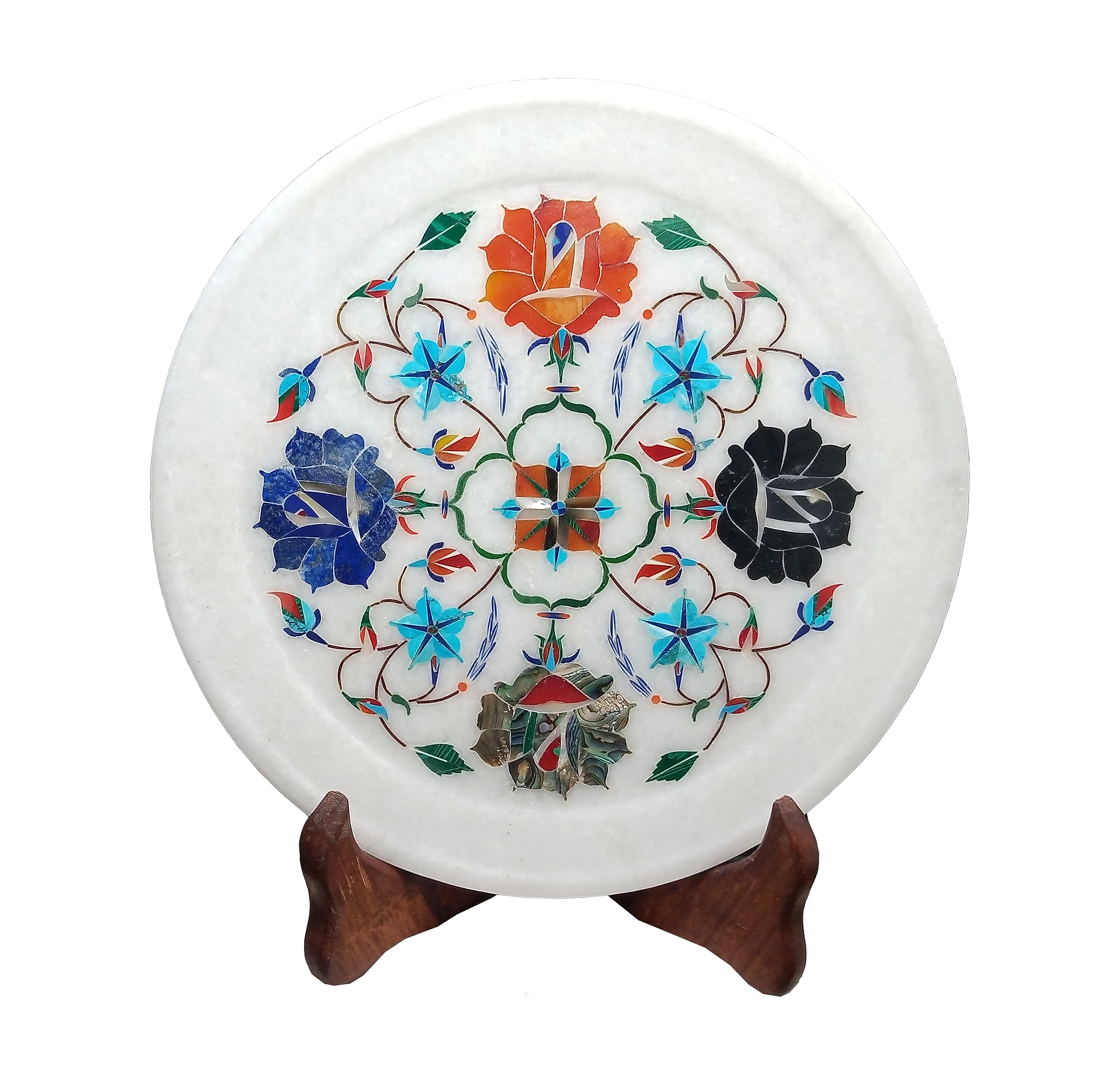 MARBLE INLAY ART AGRA - PACCHIKARI Handcrafted White Marble inlay Plate Perfect colors and elegant designs. The Exclusive marble Plate is translucent with the light so you can place the light on the back and see Magical view. Design: Colorful Rangoli Design. We will Send you paper with Description and Meaning of the stone. To maintain this art piece simply wash Soap and water clean it with cotton cloth and apply white wax for shine. The stones inlaid into the beautiful Tray are as follows- Blue --------- Lapis Lazuli. White -- Mother of Pearl Orange ------- Carnelian. Light Blue ---- Turquoise. Brown ------ Jasper. Colorful Shiny ----- Sea Shell. It is an art piece which will be a beauty & the conversation piece at home. We are himself manufacture of this product so we do custom design and bulk order also.