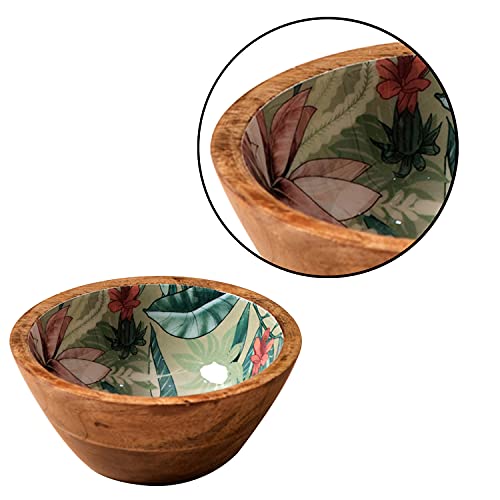 HomeKitchenServeware setsBowlServing Bowls wooden for snacks dry fruits | printed decorative potpourri bowls for gifting | Mango wood with Decaling print with clear Enamel | Green floral print 6 Inches diameter Bowl Set of 4