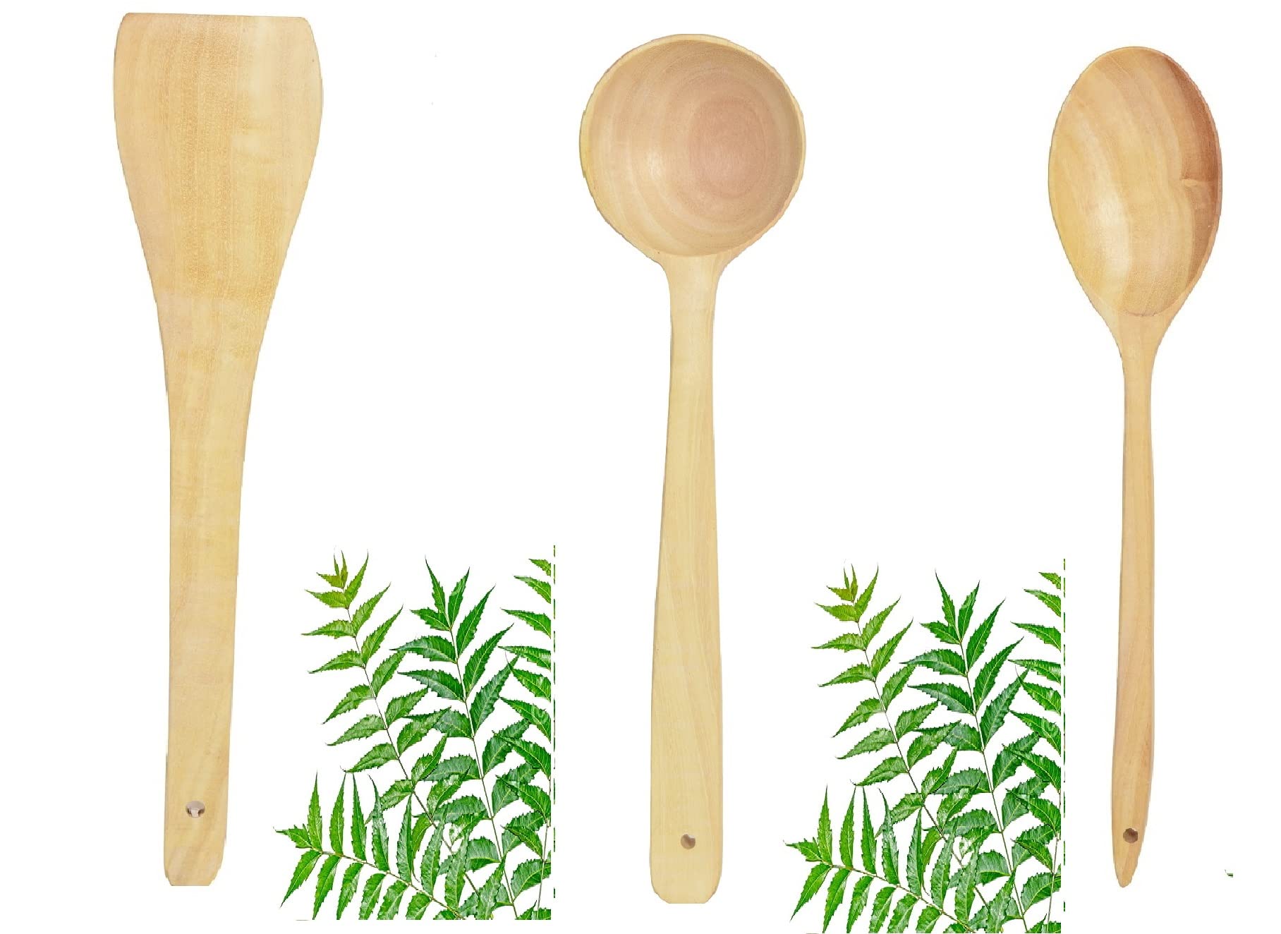 This Wooden Spoons for Container is Made of solid Neem wood which good for health and Neem wood is Anti Bacterial. Wooden spoon combo with disposable small spoon Set of 3 Kitchen tools is Safe for non-stick cookware. Get this wooden spoon eating or cooking Best Utensil set with natural finish and Non-Toxic Eco-Friendly. These spoons are totally made in India and can be used for wooden spoon jar These kitchen wooden spoons are harmless to use in any utensil or cookware. The non-scratch wooden spatula is not going to leave any scratch on your pans