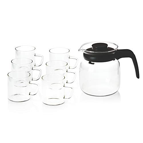 Product Description Borosil Classic Tea Set is made up of borosilicate glass that's not only durable but also so clear that it's almost non-existent the perfect cuppa in one of these is nothing short of magic. Its extreme temperature resistant and the Carafe can be used to prepare the morning tea and coffee both on gas and microwave as well. Its easy to clean and remain new even after years of usage. Its a perfect gift to give to your family friend or even yourself. The 7 piece Classic Tea Set comes with a Carafe and 6 Classic Mugs. Perfect for your daily dose of chai coffee and iced tea. From the Manufacturer The Classic Tea Set comes in two sizes â with a Carafe and 4 Classic Mugs and the second with a Carafe and 6 Classic Mugs. Perfect for your daily dose of chai coffee iced tea or even beer.Usage and CareBorosil Carafe can be used directly on the flame hot plate microwave or oven When removing the Carafe from the flame do not immediately place the hot Carafe on wet or cold surfaces. Use a coaster instead Wipe outside dry before use If using directly on the flame ensure that the flame is restricted to the glass base and doesn't reach the plastic handle. Do not use abrasive scouring agents for cleaning. Clean with soap and sponge and wipe dry Can be used in a dishwasher.