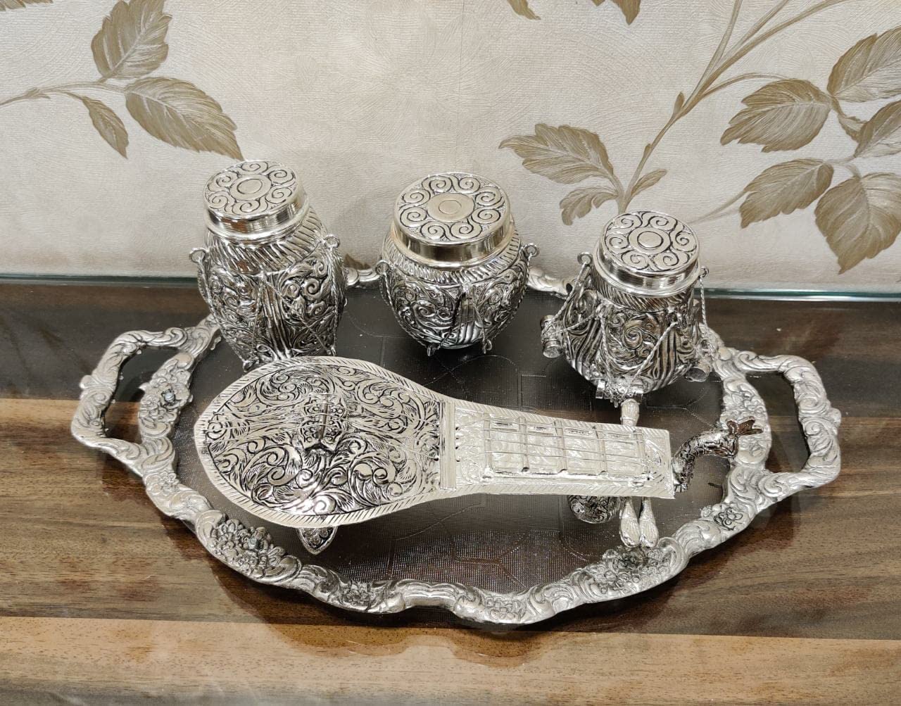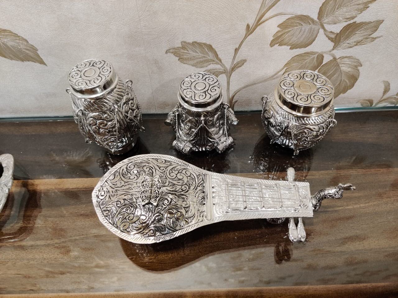 Consisting of 3 little tabla is of various shapes and sizes and a conventional Indian stringed instrument the whole set is exceptional. If you want to impress your guests with your royal taste then this mouth freshener holder designed in the shape of sitar & tabla set is just right for you. Consisting of three small handis of different shapes and sizes and a traditional Indian sitar the entire set is truly remarkable. Ideal as Indian gifts for foreigners or retirement return gifts!
