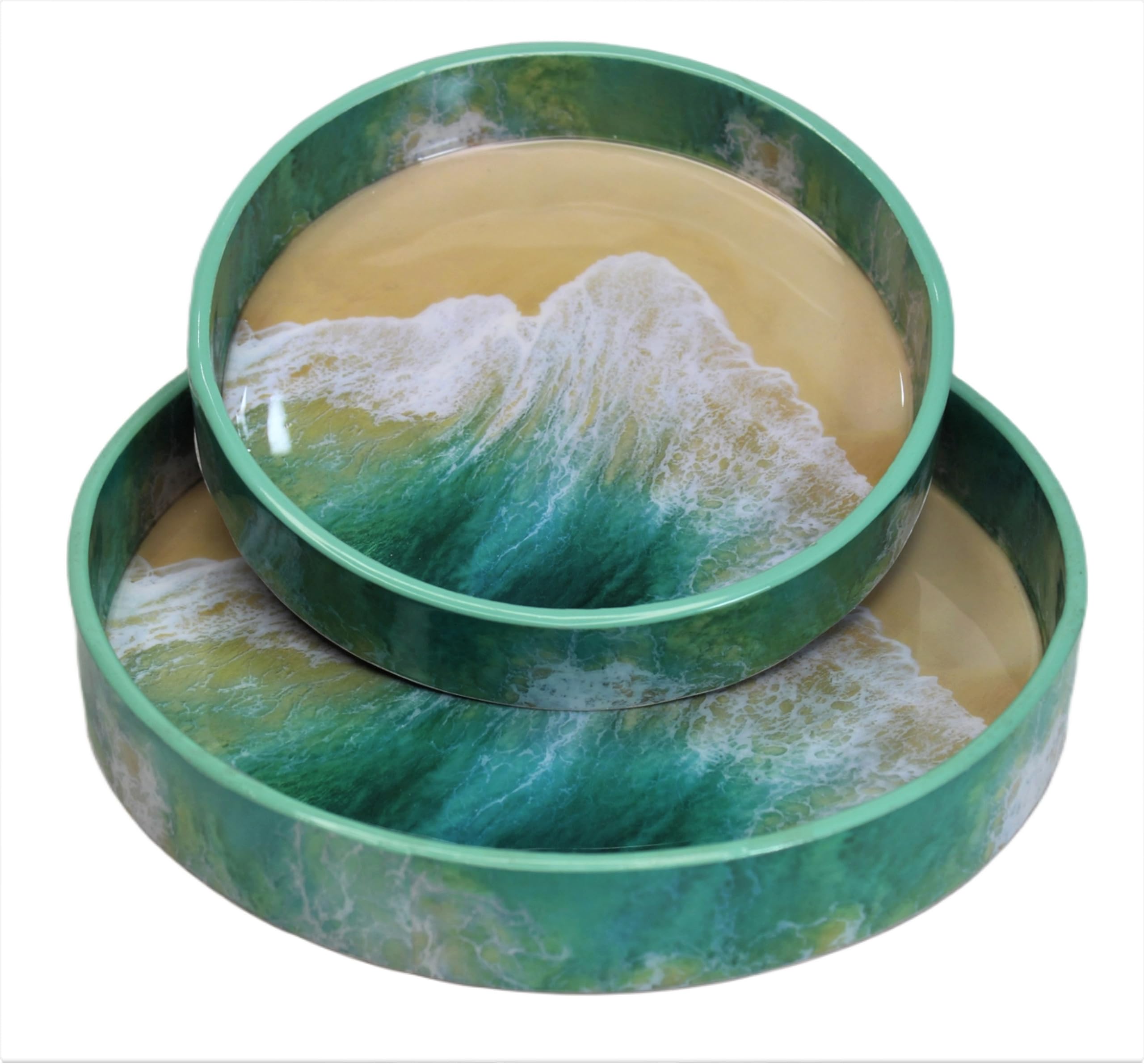 SAHARANPUR HANDICRAFTS Wooden Resin Serving Tray Set | Multipurpose Water Proof Wooden Tray for Serving(Set of 2) | sea Wave Printed Tray for Home | Water Proof Tray for Kitchen Organizer (Design-2)