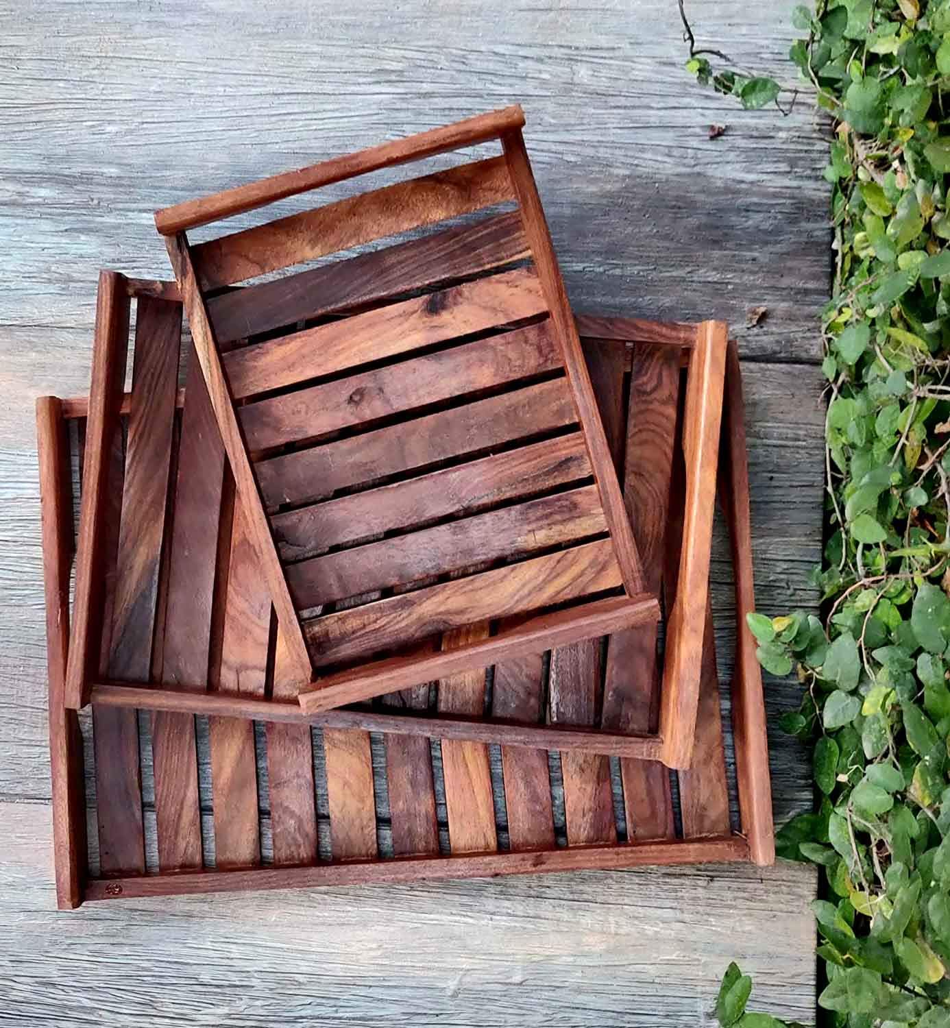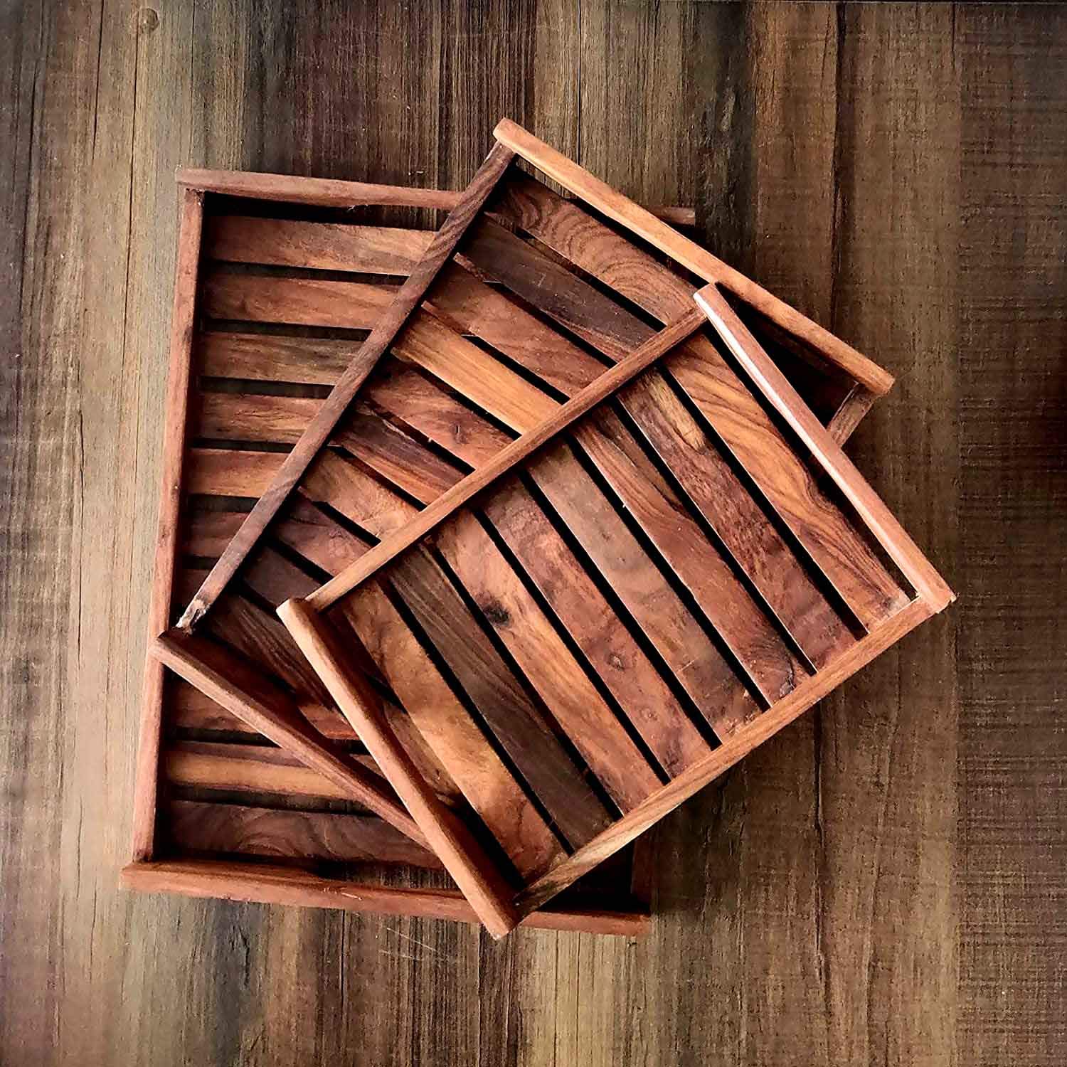 SAHARANPUR HANDICRAFTS WOODEN TRAY SET : "Antique design and unique look of Sheesham wood platter gives grace to your kitchen and steals everyone attention. This is the best product to serve different kinds of meals at a time or to serve drinks pastries snacks or french fries. Moreover it is chemically treated to prevent from any kind of natural decay. NO STAINS || EASY TO WASH ||