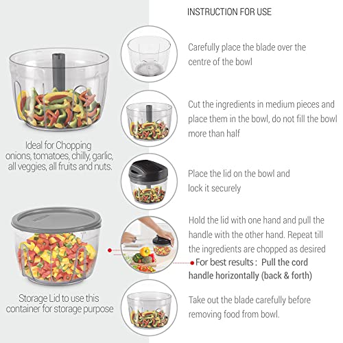 Milton Xpress Safe Chopper comes with sharp durable stainless-steel blades which comes with a safety cover. The veggie cutter is very easy to use and is featured with a non-skid base for the effortless use and satisfying results. Cut a wide variety of foods in seconds with the pull of a cord which rotates the ultra-sharp removable stainless-steel blades. This chopper has spare storage lid to use this container for storage purpose. The lid has locking mechanism for better use. It has scrapper. It is an essential device for any kitchen to keep the consistency in the meals. All you have to do is pull the string few times you can chop the big chunk of vegetables into small pieces. It is suitable for cutting all the types of vegetables fruits fresh herbs spices cooked meat fish nuts and cheese. It is an essential device for any kitchen to keep the consistency in the meals. The container can also be used for storage purpose. For any queries kindly reach customer care number as mentioned on the product packaging along with the proof of purchase.