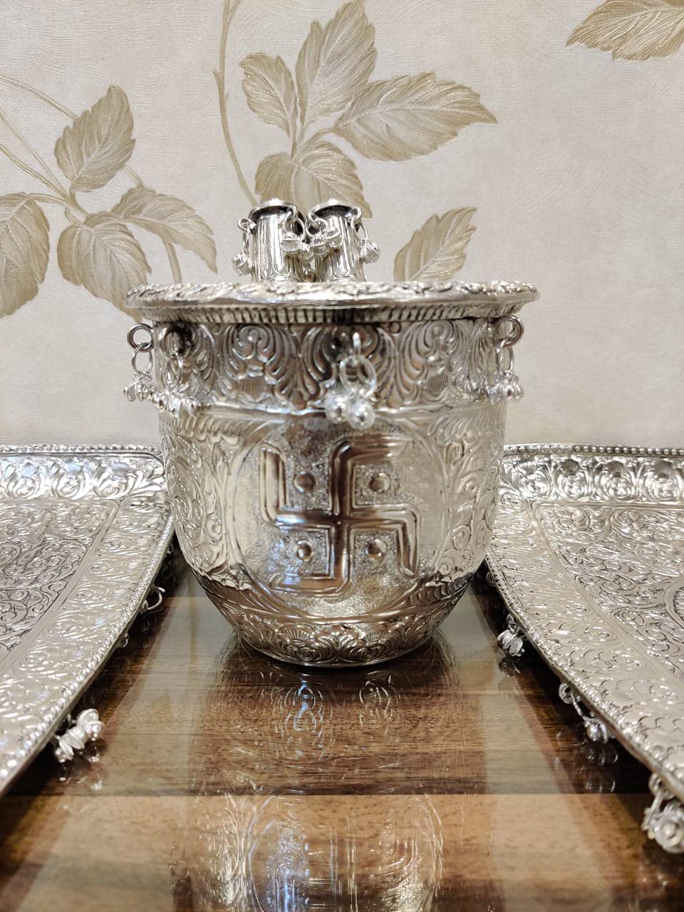 Pure German silver hand engraved- Chajla Okhli/ukhal & Musal set for Indian Wedding Rituals. Inclusions- 1 Pc Okhali 2 pc Musal 2 pc Chajla Product Size Okhli: 6.5inch X 5.5 inch Musal:7 inch Chajla:10 inch X 12 inch Khal dasta or hamam dasta is widely used products in almost all homes as well as restaurant.It is used for pulverizing various herbs such as ginger garlic cilantro peppermint leaves etc. Is also used to crush or grind dried spices. Now enjoy the freshness of spices and traditional taste at your home .