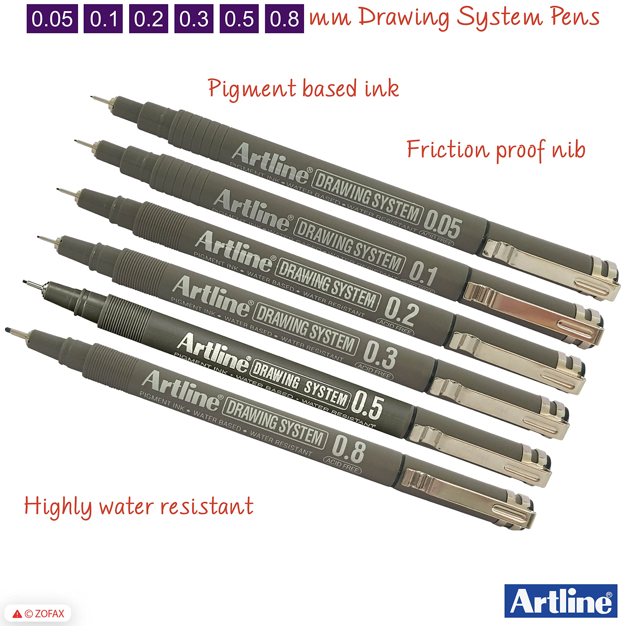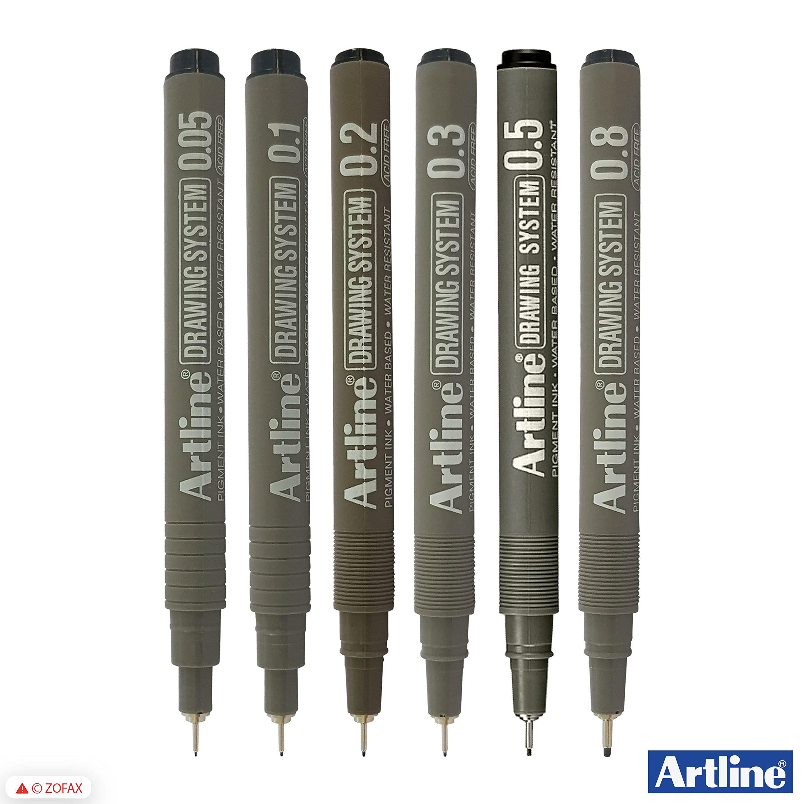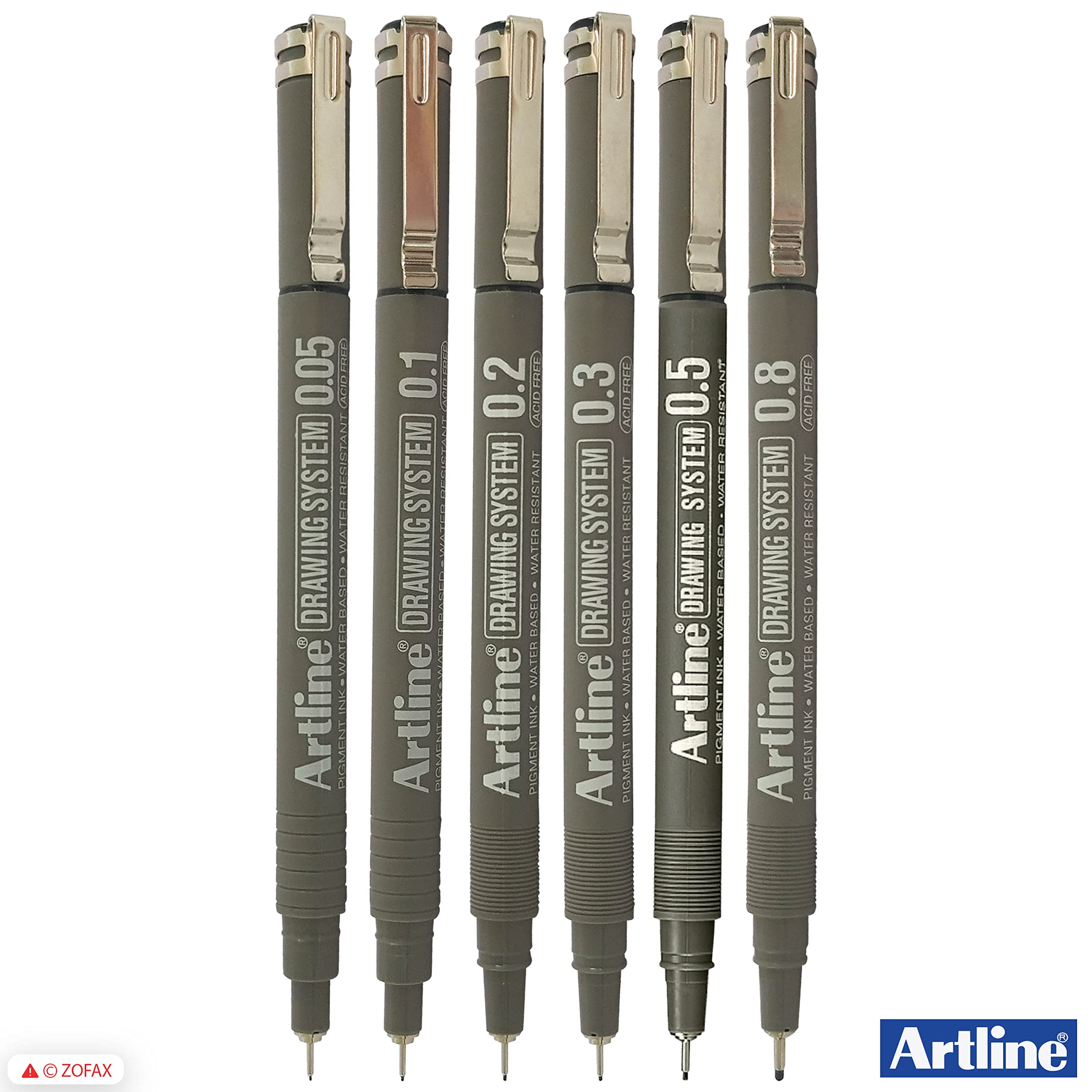 Artline Drawing System Technical Pens (BLACK) 6-Piece Wallet Set - 0.05 0.1 0.2 0.3 0.5 0.8mm Fine Tip Pens can be used for drafting illustrating and graphic design. Friction-proof nib enables you to draw a consistent writing width. Metal reinforced collar nib is suitable for ruler and template work without causing any nib damage. Acid Free. Features: Polyacetal Resin Nib Highly Water Resistant Fade-proof Water Based Ink Pigment Ink Xylene Free Recommended Use: General Writing Cards Drawing Graphics/Design