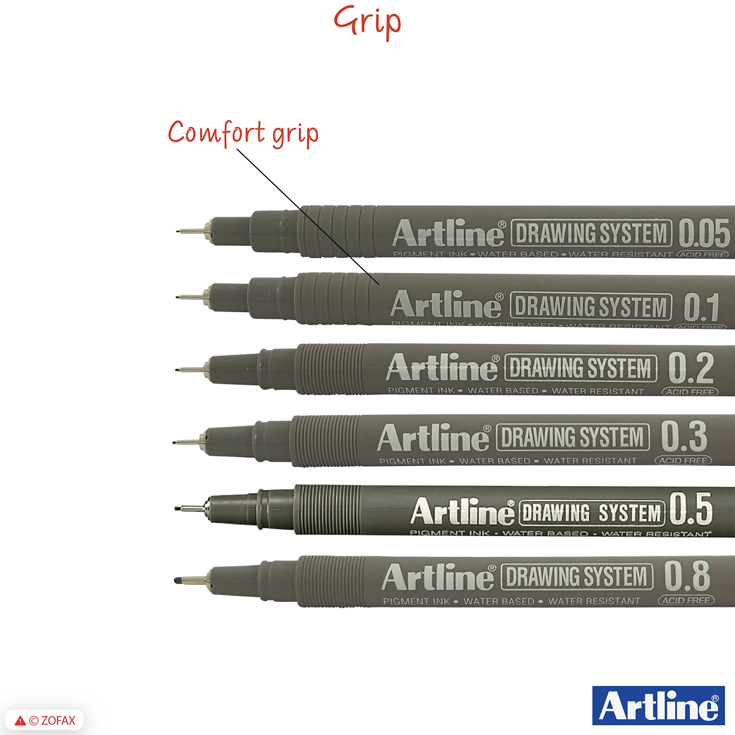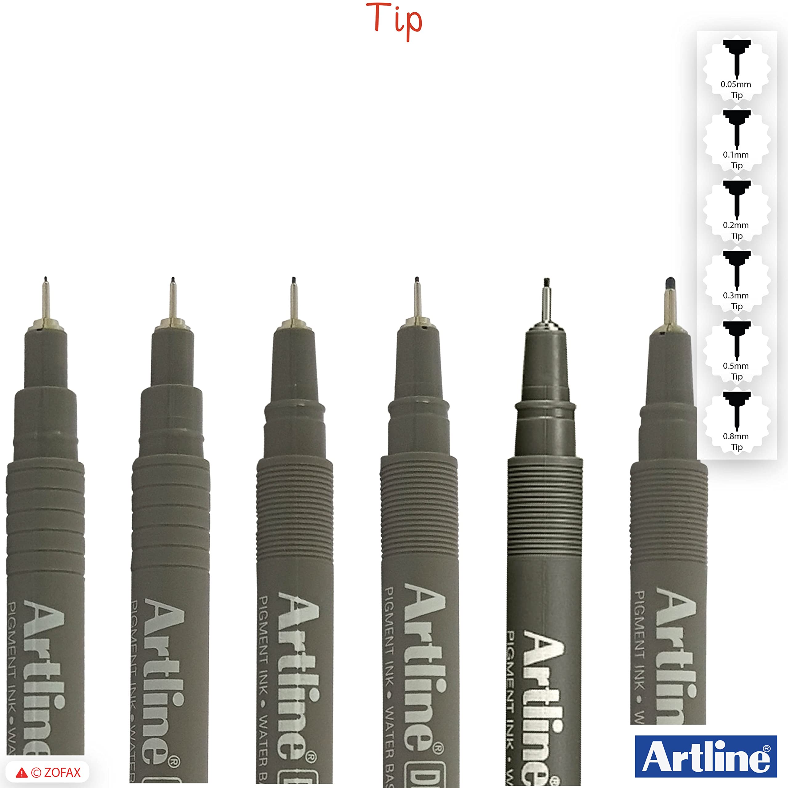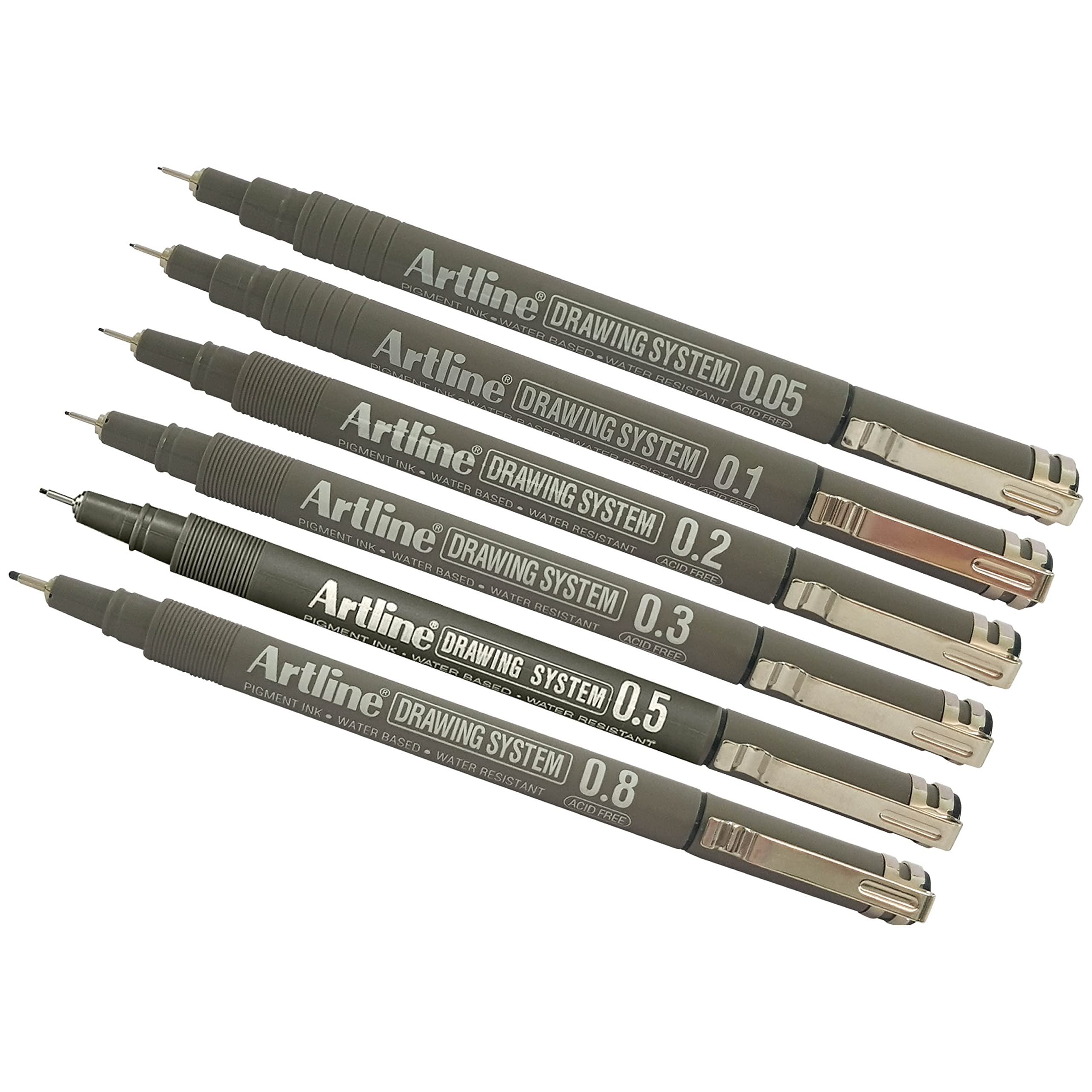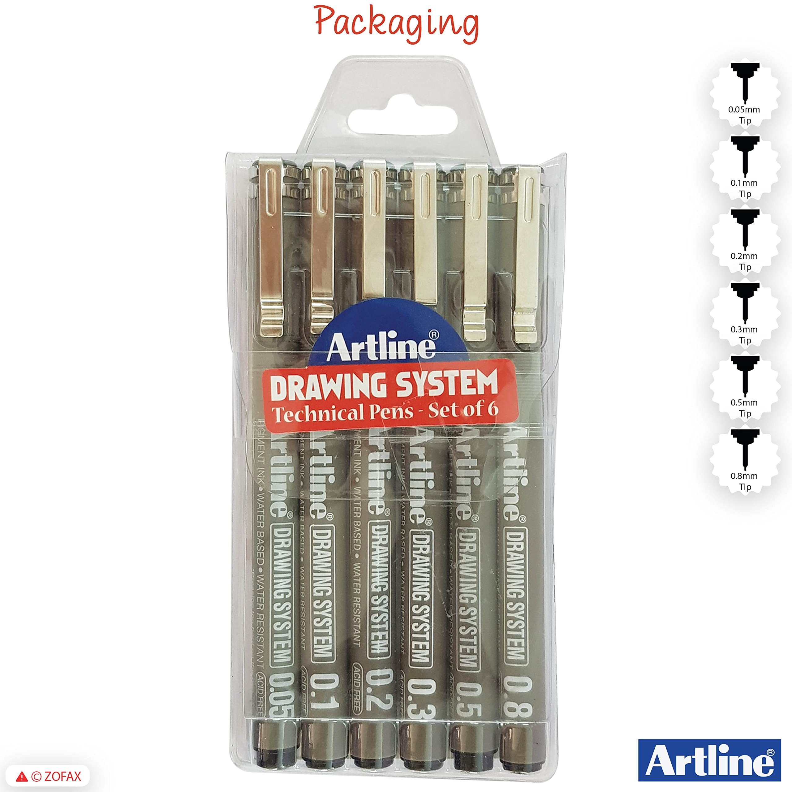 Artline Drawing System Technical Pens (BLACK) 6-Piece Wallet Set - 0.05 0.1 0.2 0.3 0.5 0.8mm Fine Tip Pens can be used for drafting illustrating and graphic design. Friction-proof nib enables you to draw a consistent writing width. Metal reinforced collar nib is suitable for ruler and template work without causing any nib damage. Acid Free. Features: Polyacetal Resin Nib Highly Water Resistant Fade-proof Water Based Ink Pigment Ink Xylene Free Recommended Use: General Writing Cards Drawing Graphics/Design