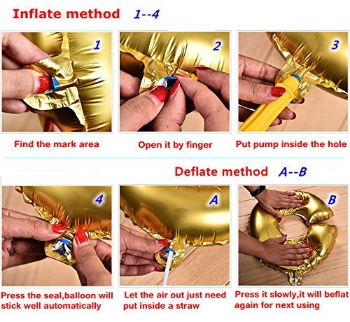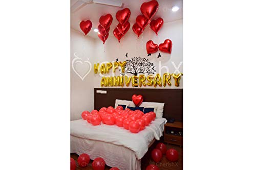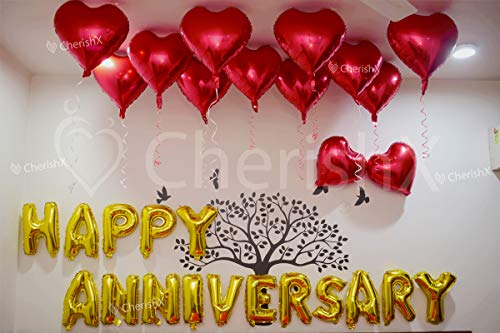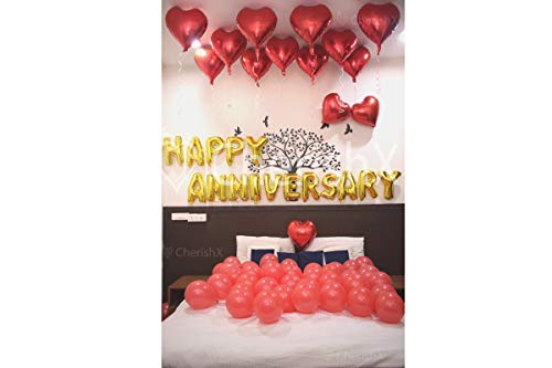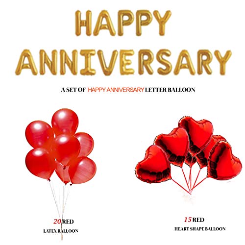 • Package includes: 8pcs 16 inches "happy anniversary" foil letter balloons (golden color) 30pcs 10 inches red latex balloons 15pcs 10 inches red hert shaped foil balloons and red ribbon roll
