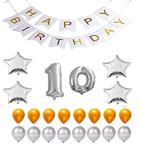 • Package Contains : ( Silver 10 Numerical Number 4 Foil Balloon Stars 25 Gold Latex and 25 Silver Latex Balloon ( 10 th Year)