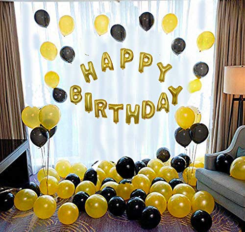 Color:Metallic Gold & Black Balloons - Pack of 43 pcsIncluded in this package are 13 pcs superior quality H-A-P-P-Y-B-I-R-T-H-D-A-Y letter foil balloons in GOLD for Brthday party decoration. Also included 30 pcs BLACK & GOLD Metallic Balloons . This item is sold and serviced by Balloon Junction. One of the pioneers in bringing a wide range of balloons party supplies and party decoration items for all kinds of occasions at your doorstep. Suitable for 16th Brthday 18th Brthday 40th Brthday 50th Brthday 75th Brthday spouse Brthday etc . Search for "Balloon Junction" in the search bar for reaching our store front.