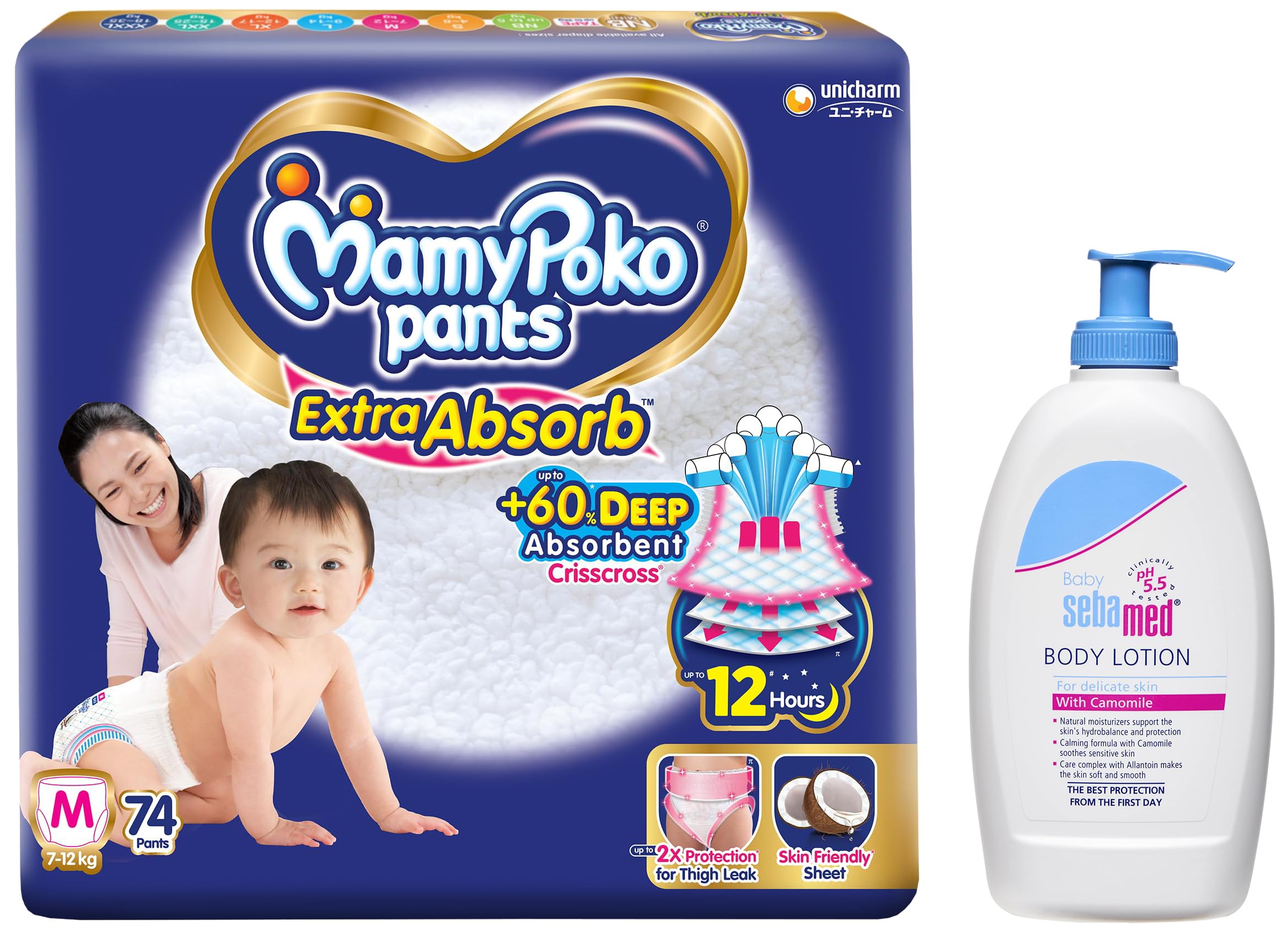 Sebamed Baby Body Lotion 400 ml, Ph 5.5 & MamyPoko Pants Extra Absorb Baby Diapers, Medium (M), 74 Count, 7-12kg