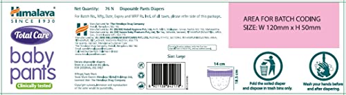 Himalaya Total Care Baby Pants Diapers Large (9-14 kg) 76 Count WhiteHimalaya Total Care Baby Pants are a one-step diaper solution specially designed for comfort protection and total care of baby's skin. Made in an easy-to-wear pant-style design that offers a soft and comfortable fit and are easy to pull on and off.Infused with the goodness of Aloe Vera and Yashada Bhasma Himalaya Total Care Baby Pants offer a protective anti-rash shield that helps reduce the activity of harmful enzymes* and helps prevent diaper rash. Himalaya Total Care Baby Pants have a Super Absorbent Polymer (SAP) layer that absorbs multiple wettings and ensures maximum protection from dampness so that your baby gets undisturbed and restful sleep.Himalaya Baby Powder (400g)Avoid using around baby eyes nose mouth and sensitive areas. Do not sprinkle directly onto baby skin to avoid accidental inhalation.