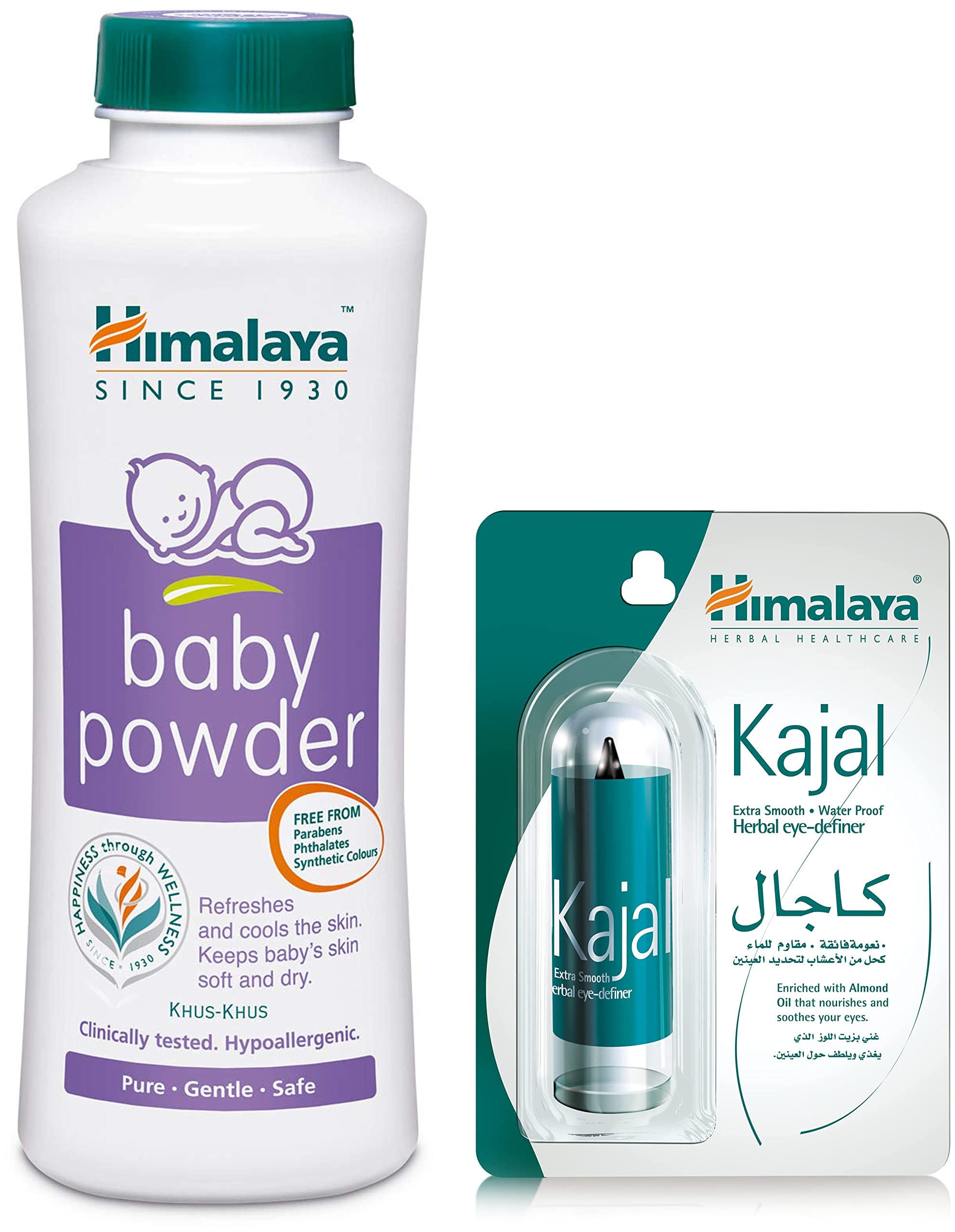 Himalaya Baby Powder (400g)Avoid using around baby eyes nose mouth and sensitive areas. Do not sprinkle directly onto baby skin to avoid accidental inhalation.Himalaya Herbals Kajal Black 2.7gKajal: Define your eyes naturally. What it does: Enriched with Damask Rose and Triphala Himalaya's herbal Kajal combines traditional ingredients like Almond Oil and Castor Oil with Damask Rose for cooling and nourishing the eyes. Triphala a unique herbal composite of three power-packed berries adds luster making the eyes look bright and attractive. Key ingredients: Almond Oil nourishes the lashes. Camphor aids in retaining eye moisture which helps keep the eyes hydrated. Castor Oil is an emollient or skin softener. It also acts as a protective barrier between the skin and harsh environmental conditions such as wind dust and dry air. Damask Rose is known for its cooling properties which help overcome eye strain. Triphala a herbal concoction of the Indian Gooseberry Inknut and Beleric Myrobalan fruits is a well-known eye tonic. Its anti-inflammatory properties help reduce eye redness and swelling. Himalaya Herbals kajal combines the natural goodness of triphala damask rose almond oil and castor oil. This handy-sized kajal can be used to give your eyes to give a bright well-groomed look. Triphala one of the key components is a unique herbal amalgamation of three varieties of power-packed berries namely ink-nut Indian gooseberry and beleric myrobalan fruit. This adds luster to the kajal and helps make the eyes look more attractive. Additionally it also serves as an eye tonic. Moreover triphala has anti-inflammatory properties that are useful in reducing swelling around the eyes. Almond oil is known for its nourishing and anti-ageing properties while camphor helps in retaining eye moisture. Castor oil another key ingredient is a natural skin softener which also acts as a protective shield between your skin and the external environment. Damask rose is well-known for its cooling properties which help combat eye strain and tiredness. Himalaya Herbals kajal eyeliner is easy to apply just put on one stroke and you are good to go. Hailing from the age-old Himalaya Herbals company that has been around since 1930 this product is tried and tested to give the best results possible. Product Features This kajal-eyeliner is suitable for all skin types given its natural and herbal origin. Useful for combatting strained and tired eyes early wrinkles and puffiness. It comes in a quantity of 2.7gms. Key ingredients are triphala almond oil castor oil damask rose and camphor. This product is suitable for women.