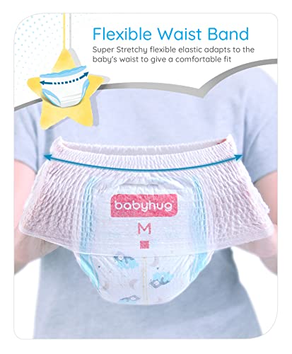 Babyhug Pro bubble care premium pant style diapers are made with a silky soft & breathable material best for your baby's delicate skin. The bubble layer technology provides quick absorption and keeps baby dry for upto 12 hours. These diapers are enriched with shea butter to protect & moisturise baby's skin. The flexible waist band makes them super comfortable while the leak guard keeps potential leakage at bay. A convenient wetness indicator turns from yellow to blue when it is time for a diaper change.