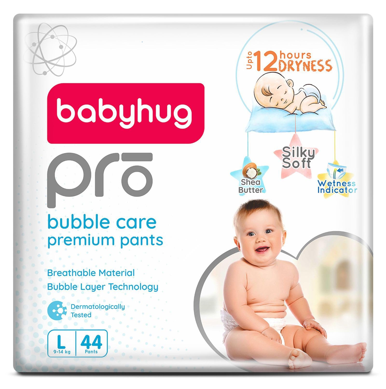 Key Features: Breathable material silky soft Upto 12 hours dryness Dermatologically tested With bubble layer technology With wetness indicator Specifications: Brand - Babyhug Pro Type - Baby Diapers Material - Coding foil Tissue Napkin Non Woven PE Film Plastic Dimensions - L 23 x B 12 x H 33 cm Weight - 1300 g Product Description: Babyhug Pro bubble care premium pant style diapers are made with a silky soft & breathable material best for your baby's delicate skin. The bubble layer technology provides quick absorption and keeps baby dry for upto 12 hours. These diapers are enriched with shea butter to protect & moisturise baby's skin. The flexible waist band makes them super comfortable while the leak guard keeps potential leakage at bay. A convenient wetness indicator turns from yellow to blue when it is time for a diaper change.