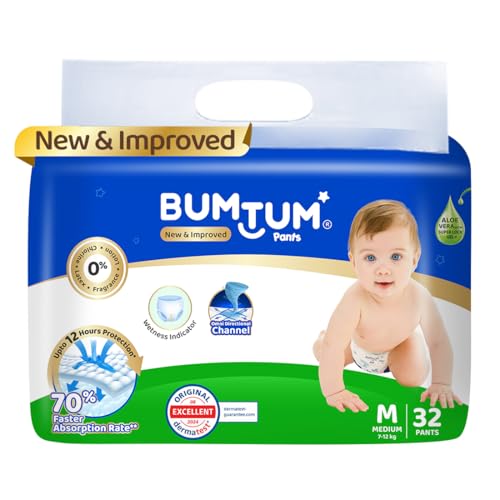 Bumtum Baby Diaper Pants, Medium/M Size 32 pcs, Double Layer Leakage Protection Infused With Aloe Vera, Cottony Soft High Absorb Technology, 1 count