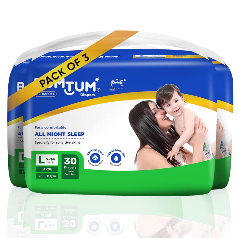Bumtum Baby Taped Diapers Large Size 90 Count 12 Hrs Leakage Protection Infused With Aloe Vera Cottony Soft High Absorb Technology (Pack of 3)