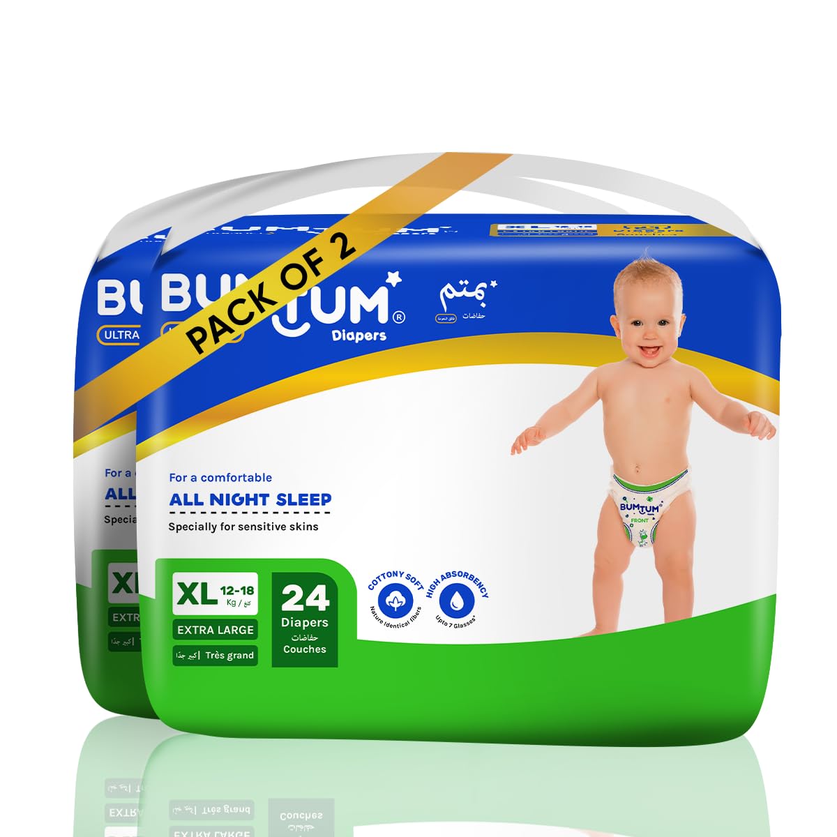 Bumtum Baby Taped Diapers X-Large Size 48 Count 12 Hrs Leakage Protection Infused With Aloe Vera Cottony Soft High Absorb Technology (Pack of 2)